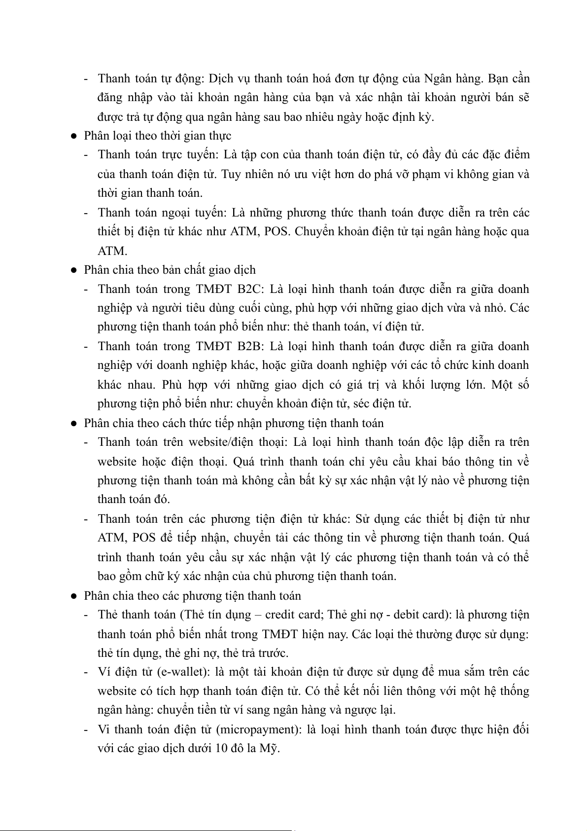 thường được phân loại thành bốn loại: Thẻ tín dụng, thẻ ghi nợ, tiền điện tử, hệ thống micropayment (Maiyo, 2013).