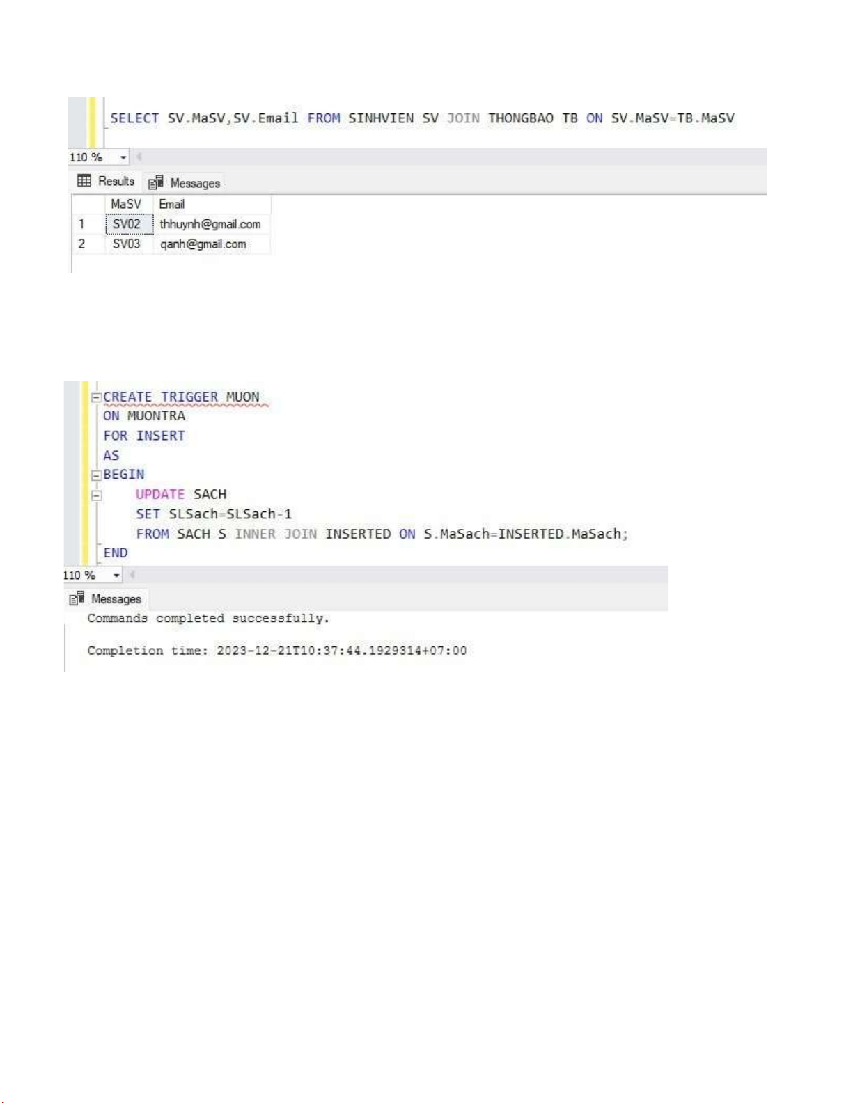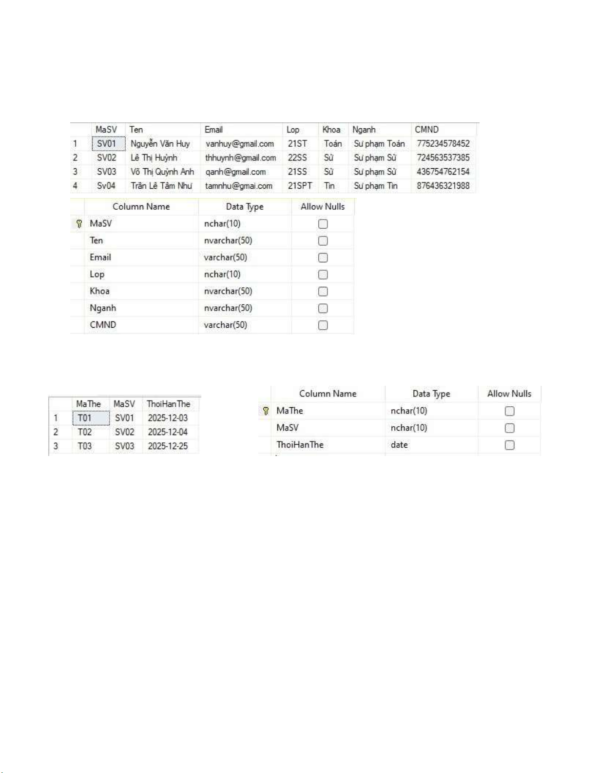 - Liệt kê MaSV và Email của sinh viên quá hạn trả sách trong bảng THONGBAO: lOMoAR cPSD| 59062190