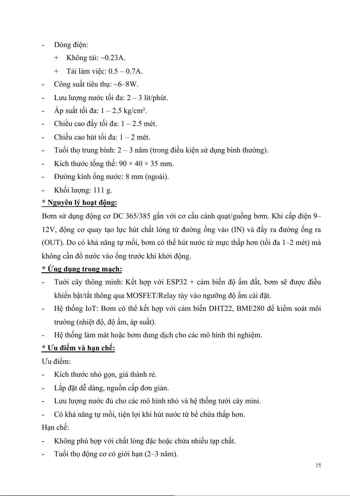 • Thiết bị: Sử dụng 1 bơm nước mini 12V được điều khiển thông