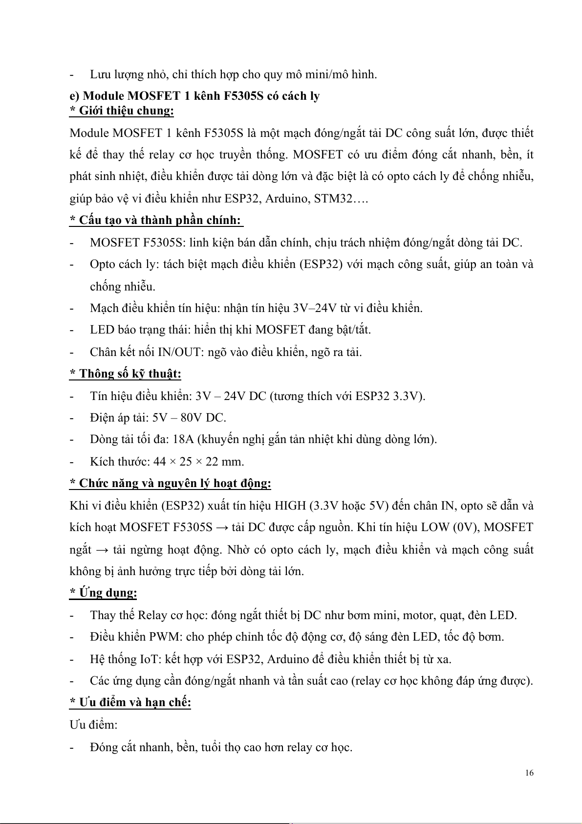 - Thay thế Relay cơ học: đóng ngắt thiết bị DC như bơm mini, motor, quạt, đèn LED.