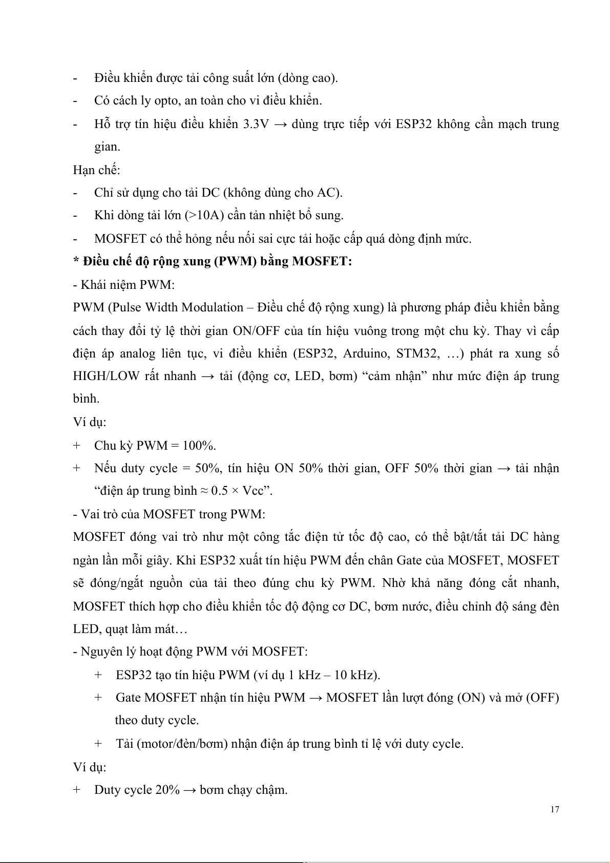 + Tải (motor/đèn/bơm) nhận điện áp trung bình tỉ lệ với duty cycle. Ví dụ: