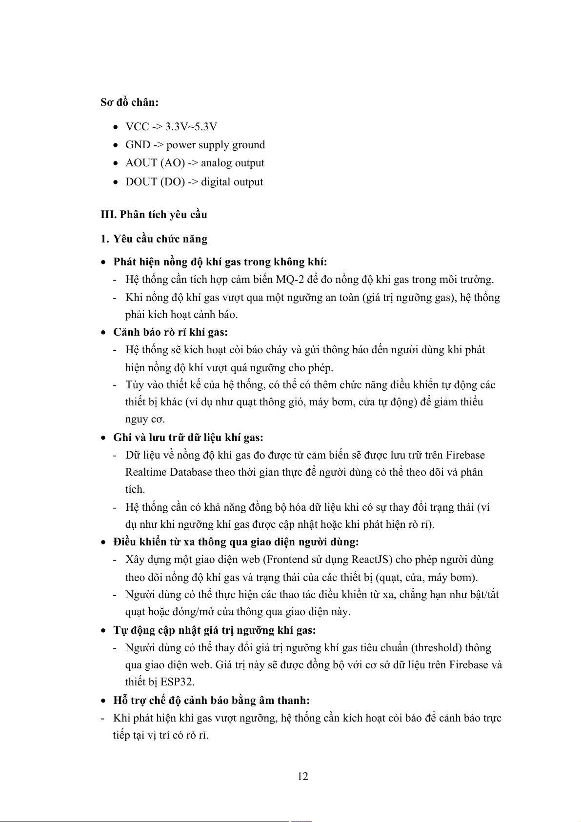 - Hệ thống cần tích hợp cảm biến MQ-2 để đo nồng độ khí gas trong môi trường.