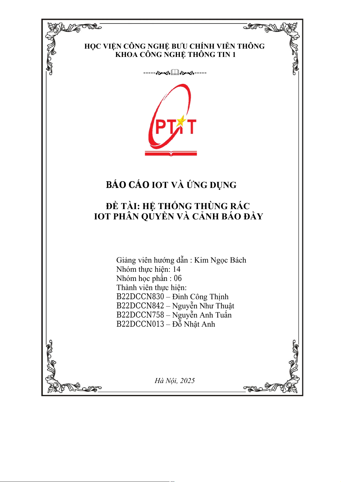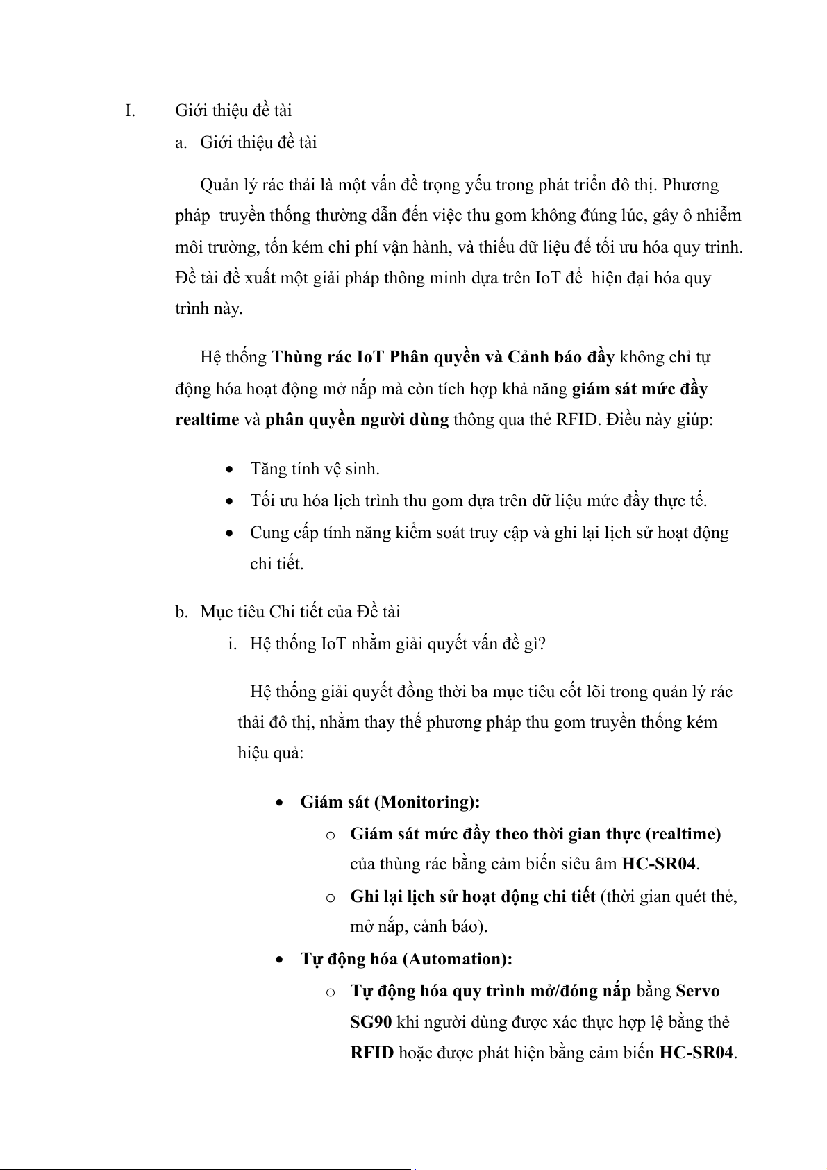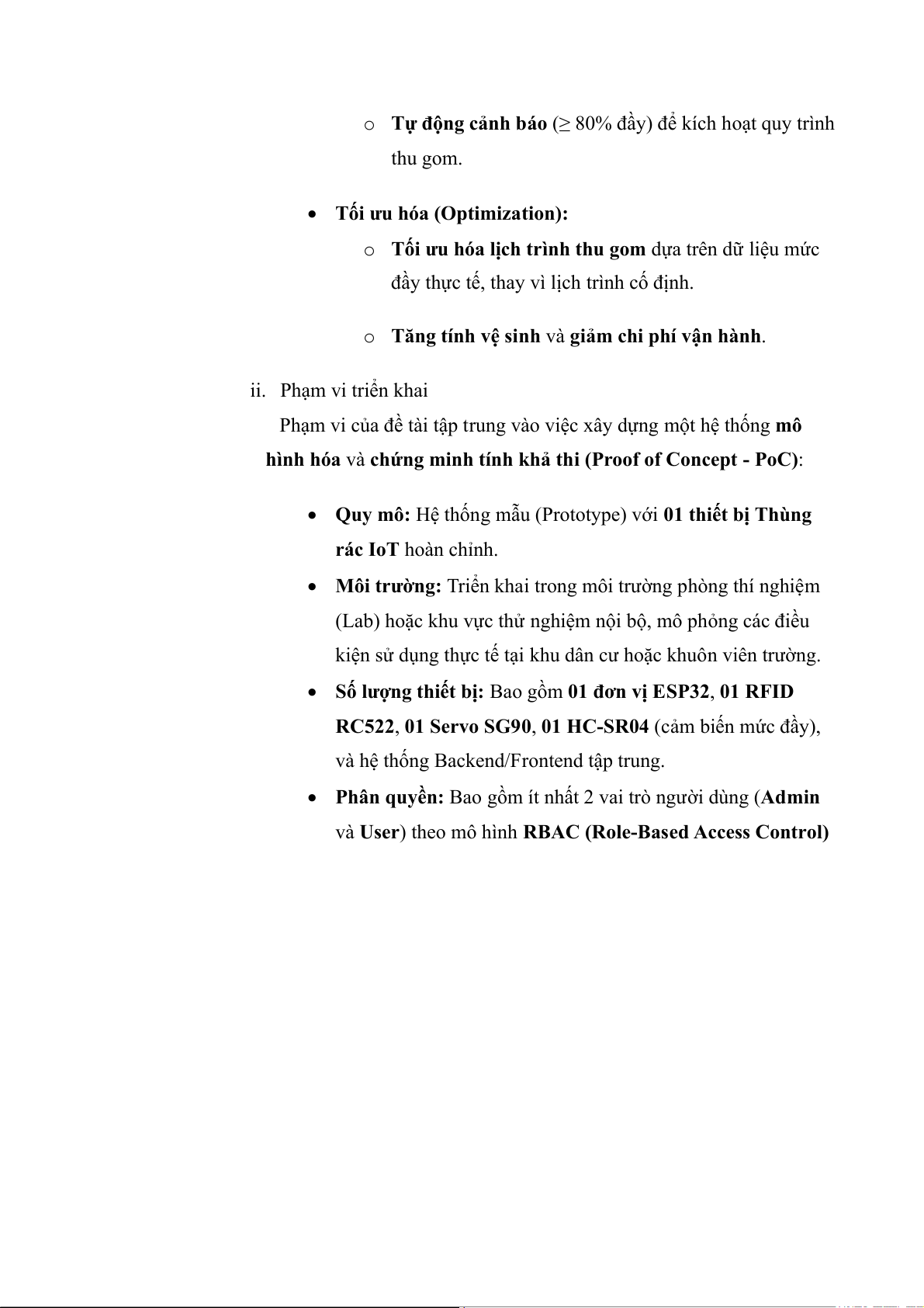 • Quy mô: Hệ thống mẫu (Prototype) với 01 thiết bị Thùng rác IoT hoàn chỉnh.