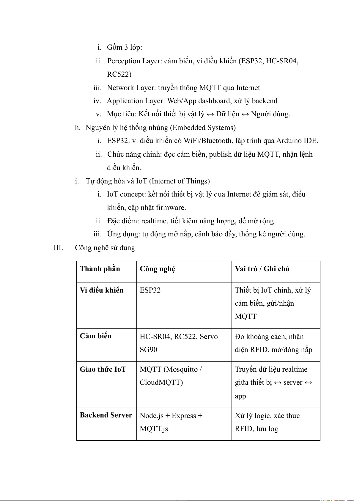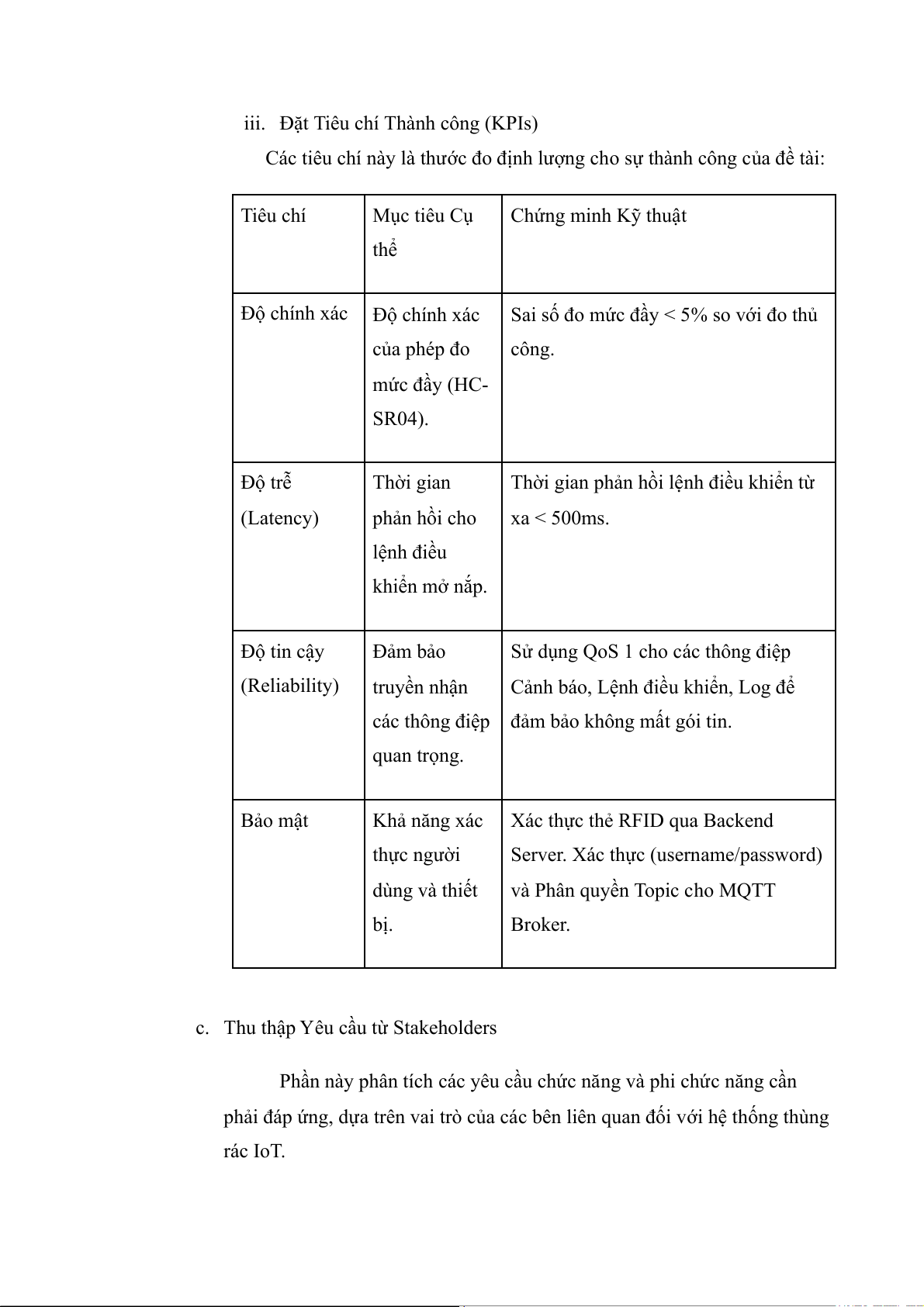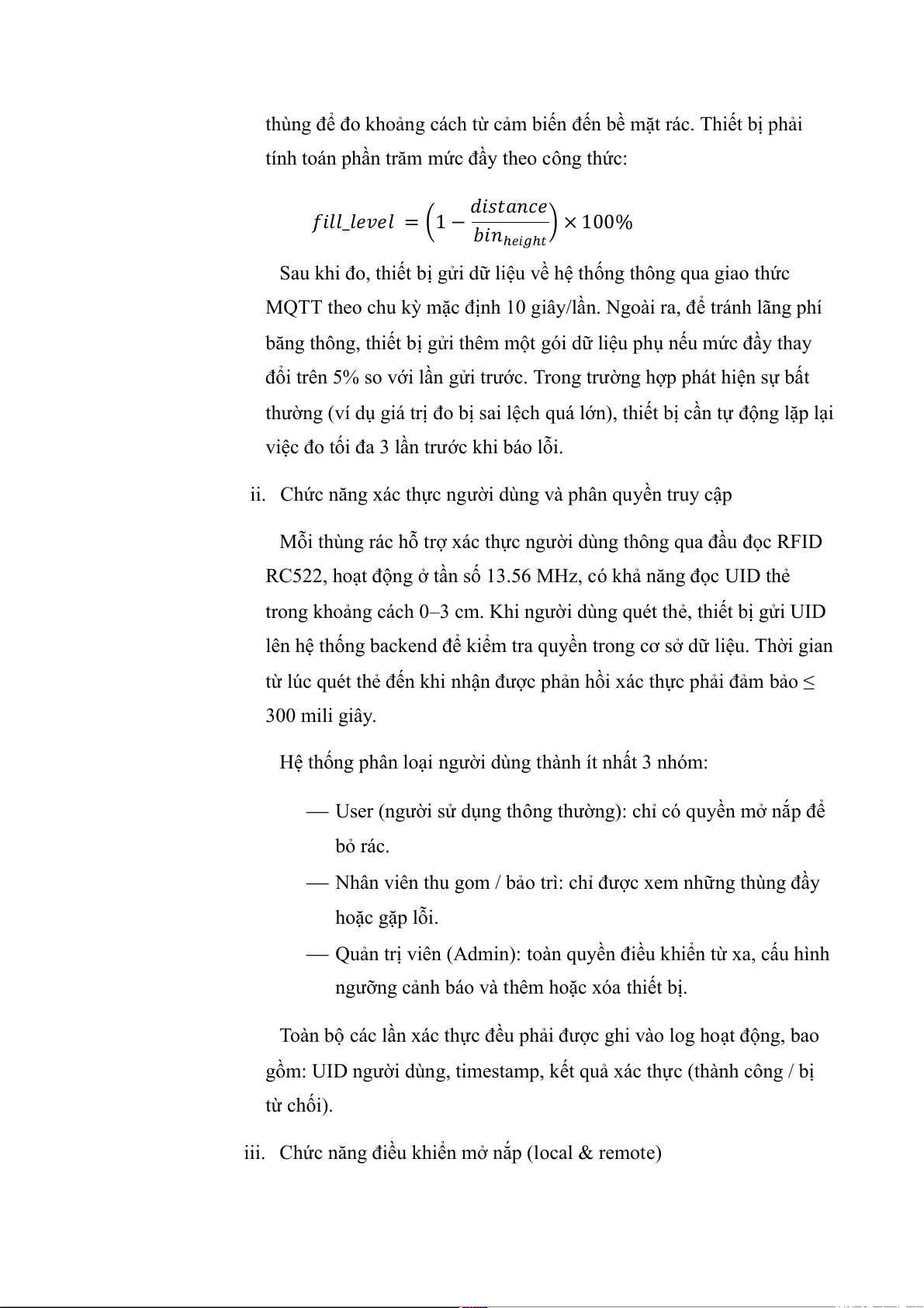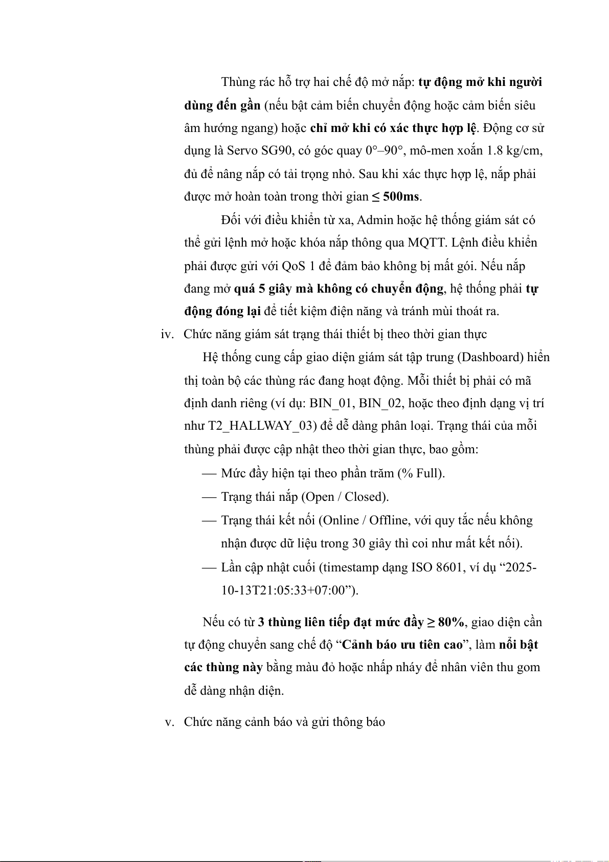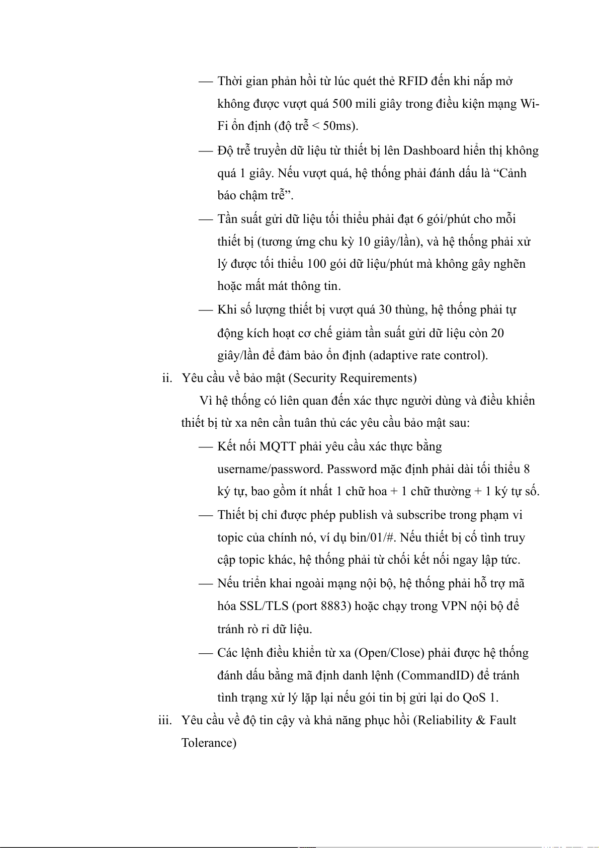 Sai số đo mức đầy < 5% so với đo thủ của phép đo công. mức đầy (HC- SR04). Độ trễ Thời gian Thời gian phản hồi ệ l nh điều khiển từ (Latency) phản hồi cho xa < 500ms. lệnh điều khiển mở nắp. Độ tin ậ c y Đảm bảo