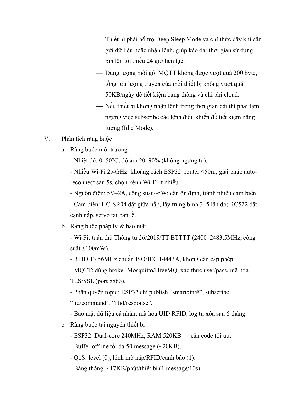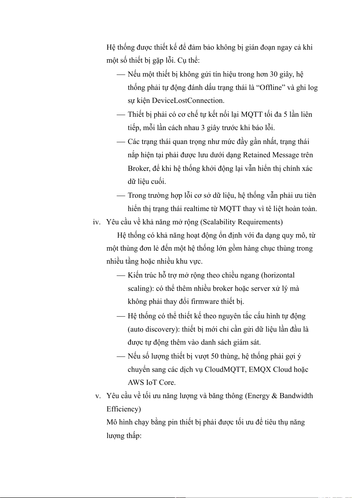 - Băng thông: ~17KB/phút/thiết bị (1 message/10s). d. Ràng buộc hiệu năng