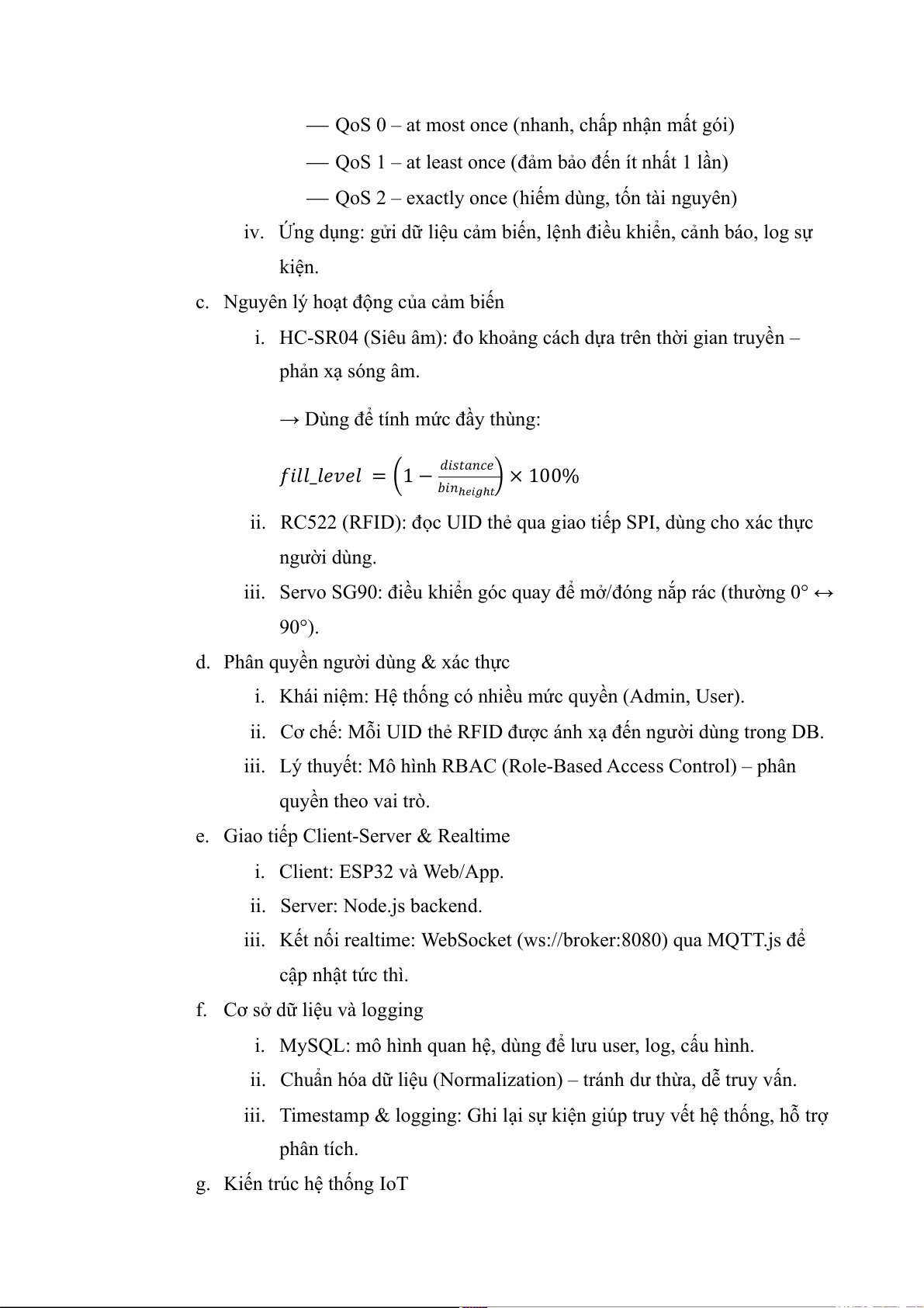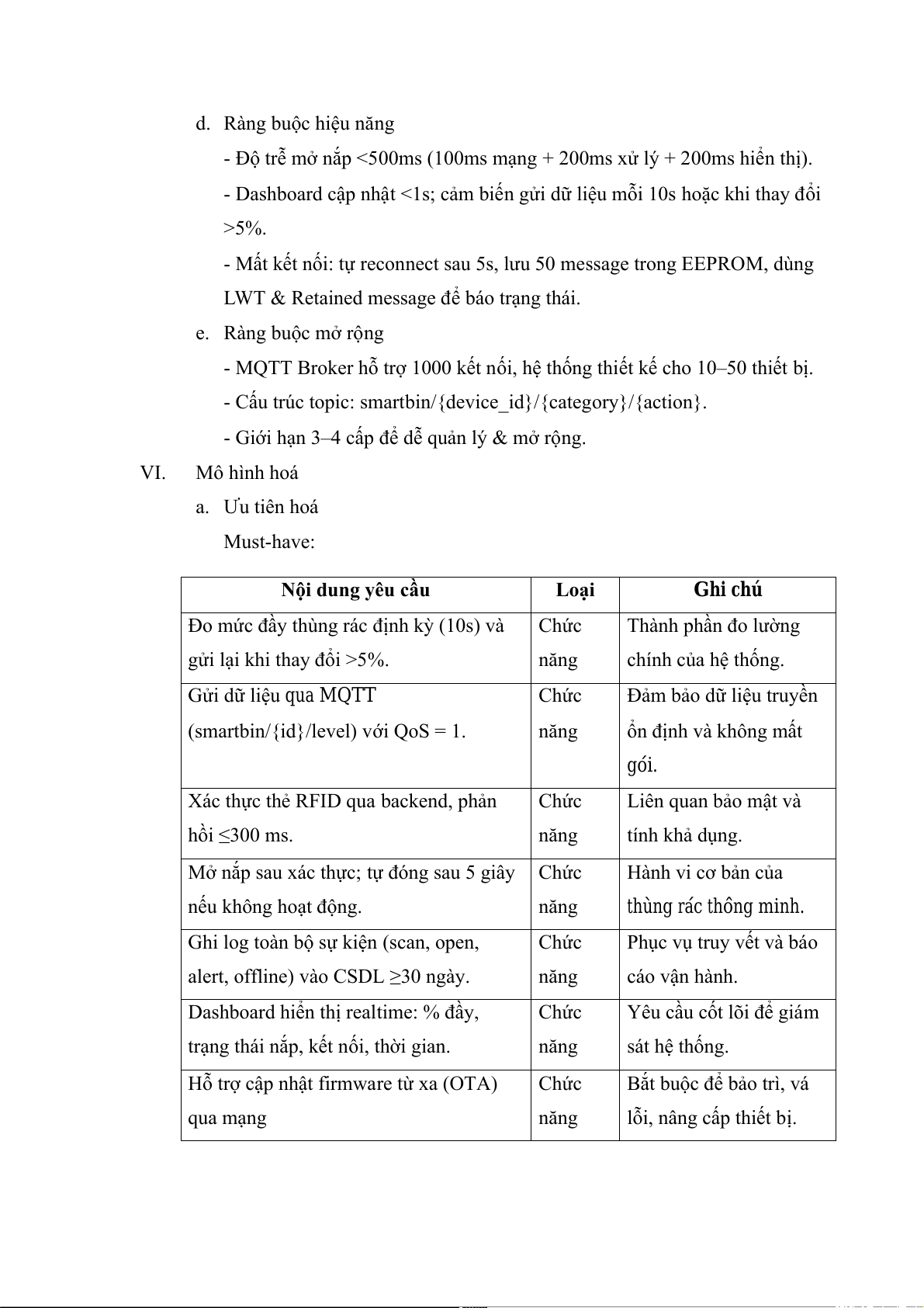 - Cấu trúc topic: smartbin/{device_id}/{category}/{action}. - Giới ạ