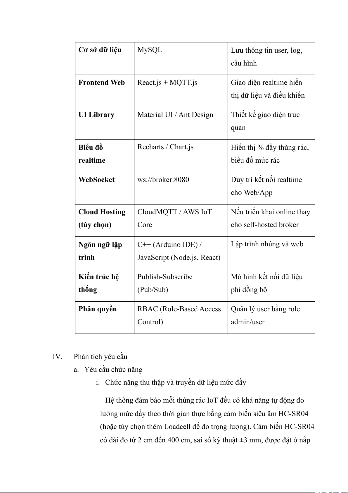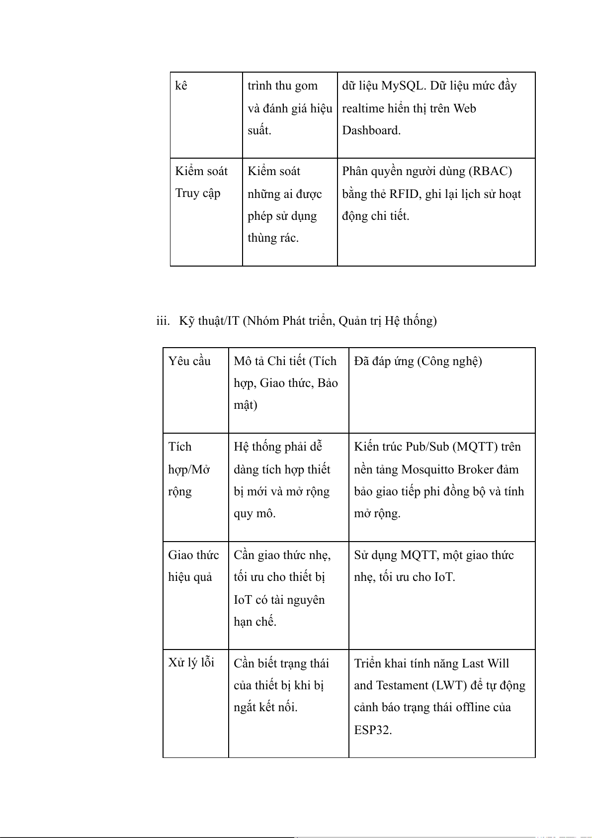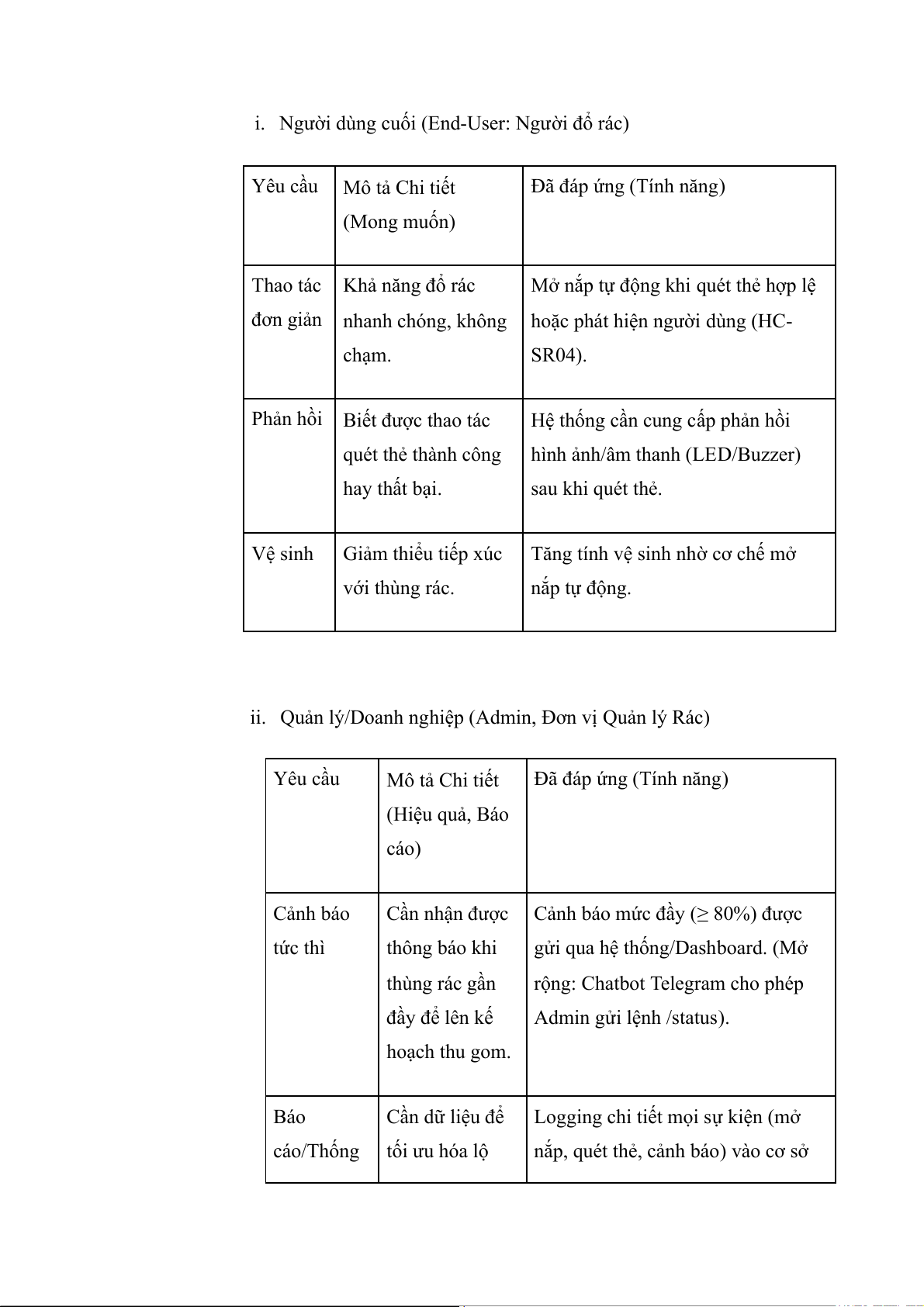 phải đáp ứng, dựa trên vai trò của các bên liên quan đối với hệ thống thùng rác IoT.