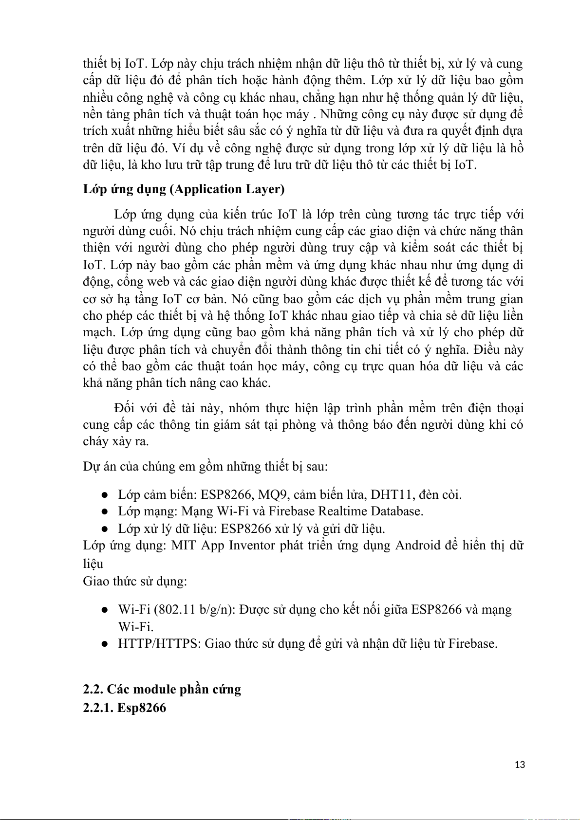 ● Lớp cảm biến: ESP8266, MQ9, cảm biến lửa, DHT11, đèn còi.