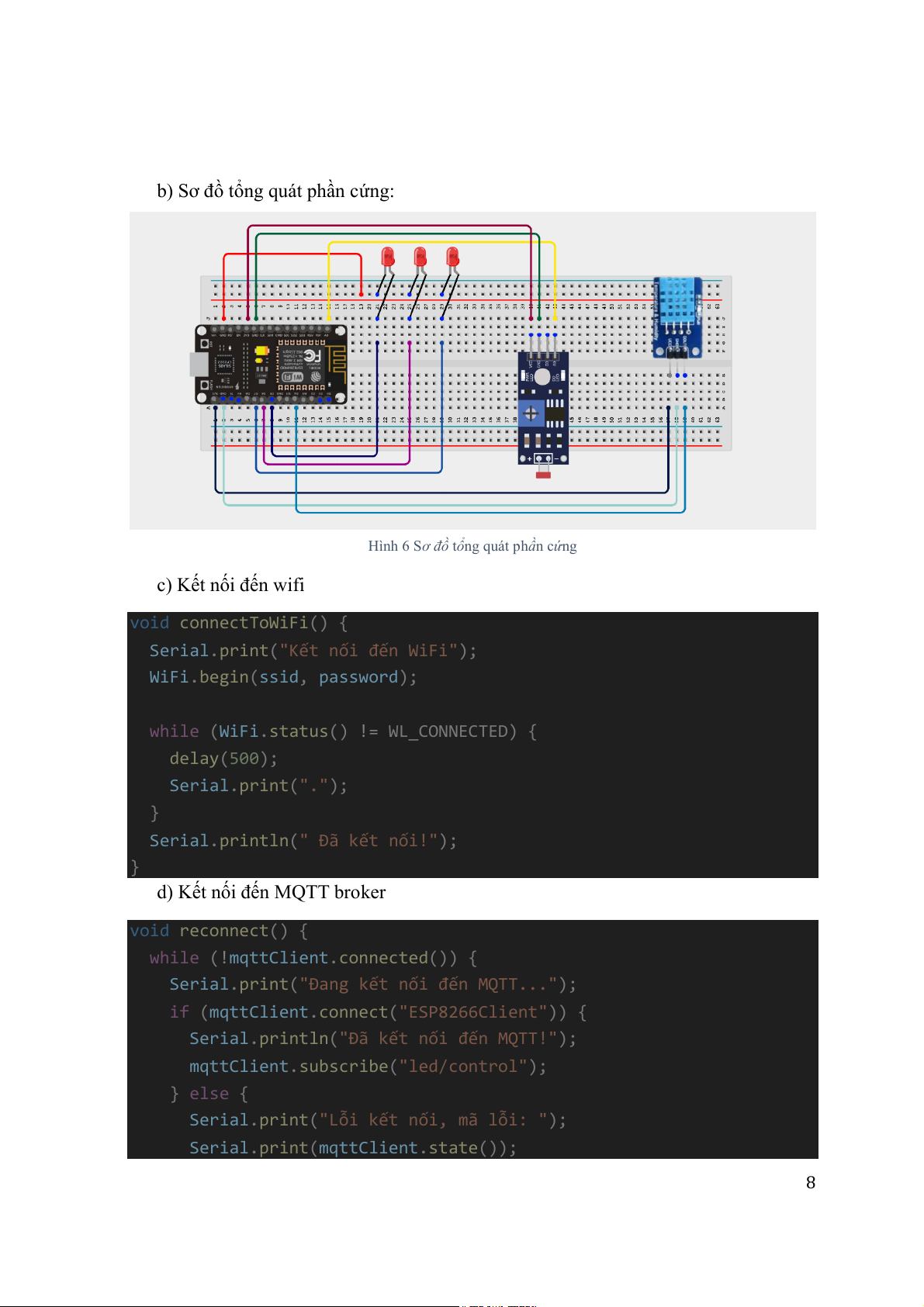 Hình 6 Sơ đồ tổng quát phần cứng c) Kết nối đến wifi void connectToWiFi() { Serial. ( print ); "Kết nối đến WiFi" WiFi. ( begin , ssid ); password while (WiFi. () status WL_CONNECTED) { != delay(500); Serial.print( ); "." } Serial.println( ); " Đã kết nối!" }