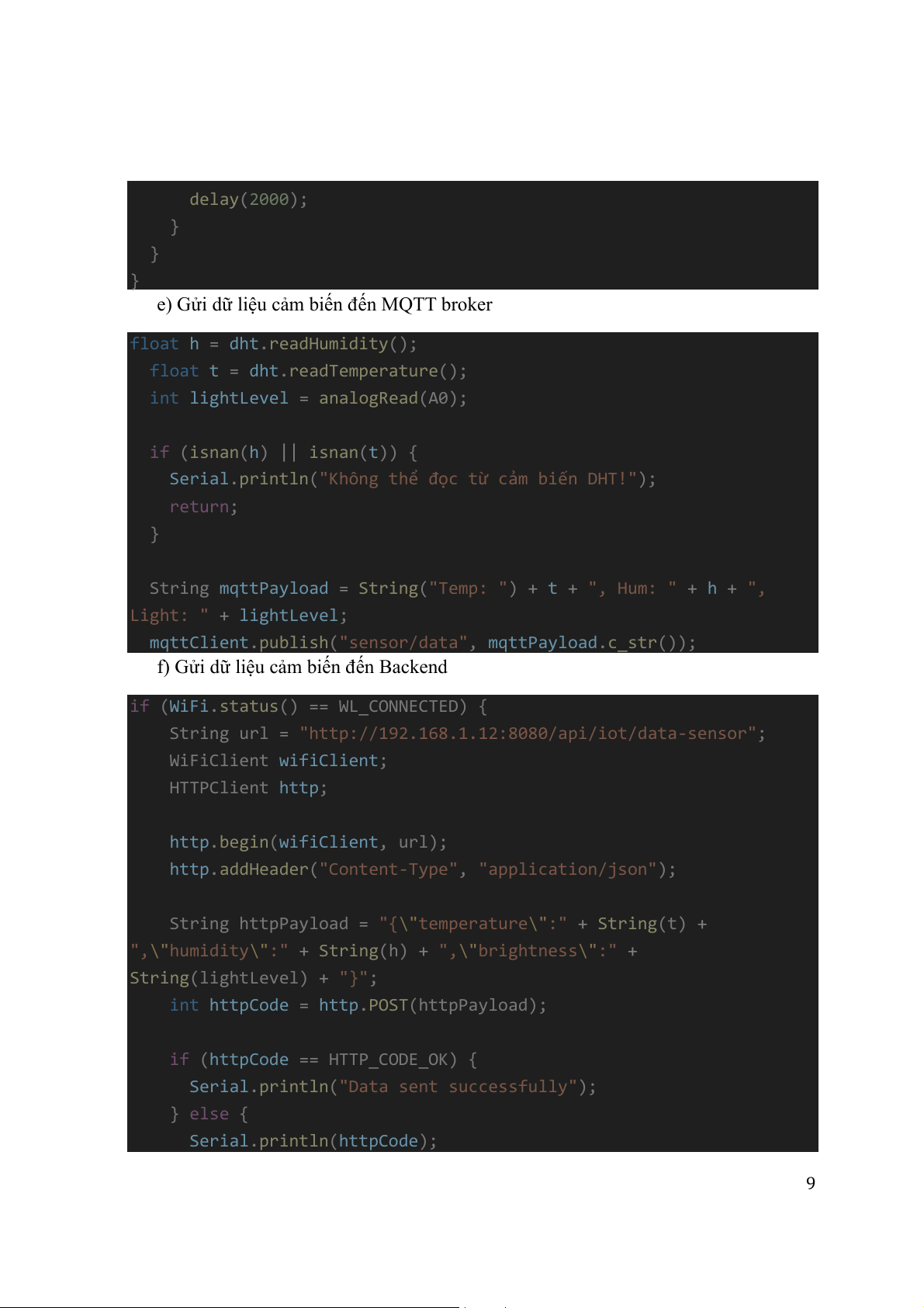 "http://192.168.1.12:8080/api/iot/data-sensor" WiFiClient ; wifiClient HTTPClient ; http http. ( begin , url); wifiClient http. ( addHeader , "Content-Type" ); "application/json" String httpPayload = "{ temperature \" \" :" + (t) String + ", humidity \" :" \" + String + (h) ", brightness \" :" \" + String(lightLevel) + "}"; int httpCode = http. (httpPayload); POST ( if httpCode HTTP_CODE_OK) { == Serial. ( println ); "Data sent successfully" } { else Serial. ( println ); httpCode 9 Serial. ( println ); "Error sending data" Serial. ( println http.getString()); } http. (); end