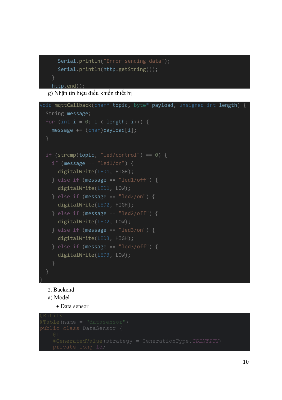 g) Nhận tín hiệu điều khiển thiết bị void mqttCallback char* ( topic, * byte payload unsigned , int length) { String ; message ( for int i = ; 0 i < ; length i ) { ++ message ( += char) [ payload ]; i } ( if strcmp( , topic "led/control") == 0) { ( if message == ) { "led1/on" digitalWrite( , HIGH); LED1 } else ( if message == ) { "led1/off" digitalWrite( , LOW); LED1 } else ( if message == "led2/on") { digitalWrite( , HIGH); LED2 } else ( if message == ) { "led2/off" digitalWrite( , LOW); LED2 } else ( if message == "led3/on") { digitalWrite( , HIGH); LED3 } else ( if message == ) { "led3/off" digitalWrite( , LOW); LED3 } } } 2. Backend a) Model • Data sensor @Entity @Table(name = "datasensor") public class DataSensor { @Id