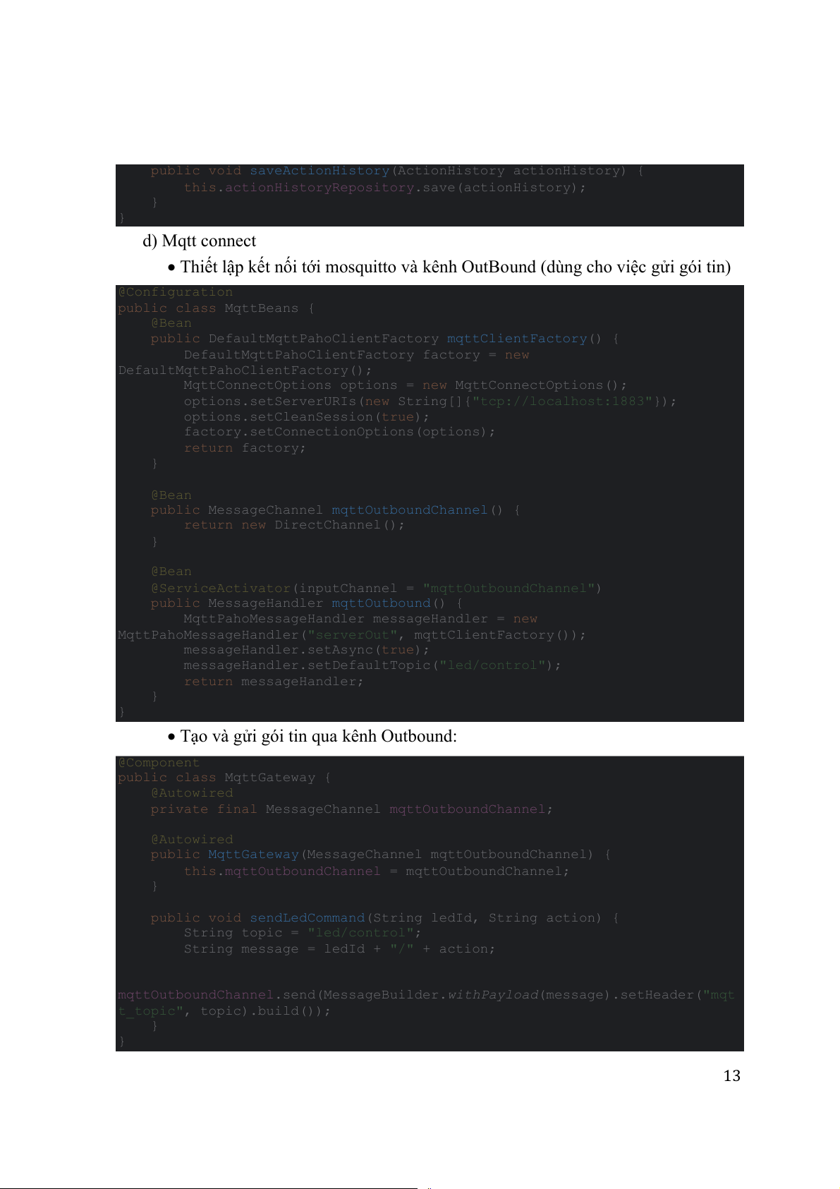 • Tạo và gửi gói tin qua kênh Outbound: @Component public class MqttGateway { @Autowired