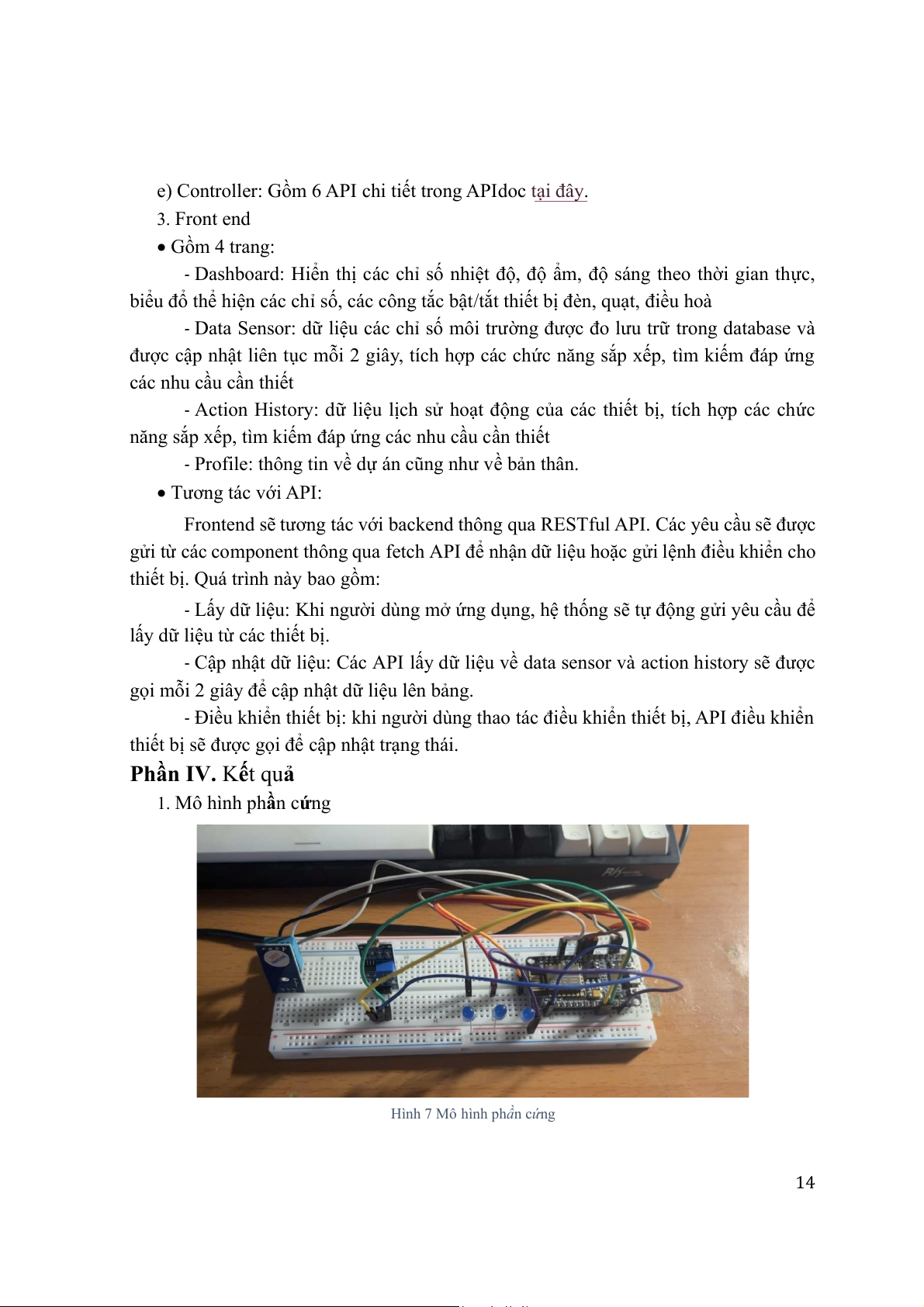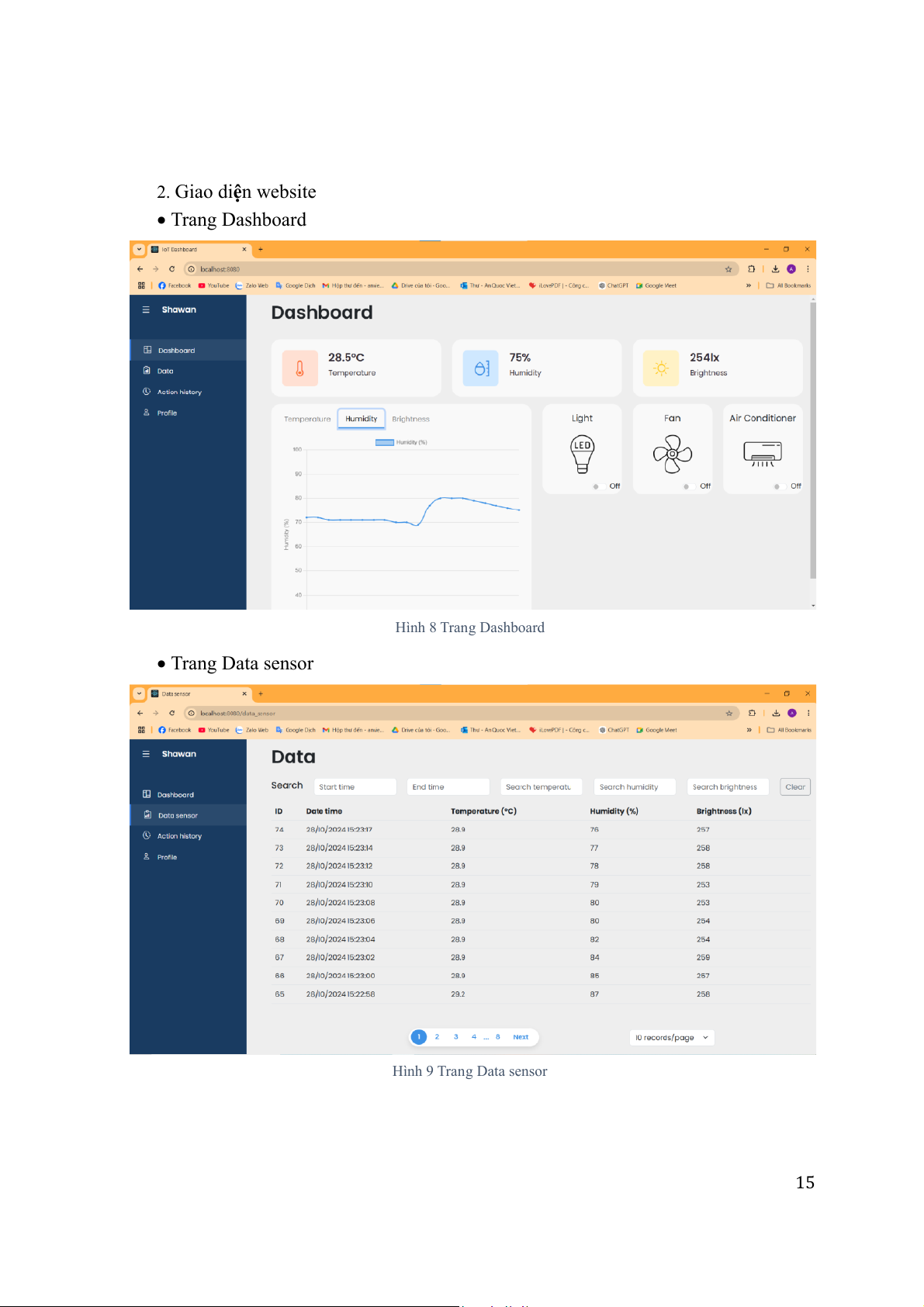 Hình 7 Mô hình phần cứng 14 2. Giao diện website • Trang Dashboard Hình 8 Trang Dashboard • Trang Data sensor Hình 9 Trang Data sensor 15 • Trang Action history Hình 10 Trang Action history • Trang Profile Hình 11 Trang Profile 16