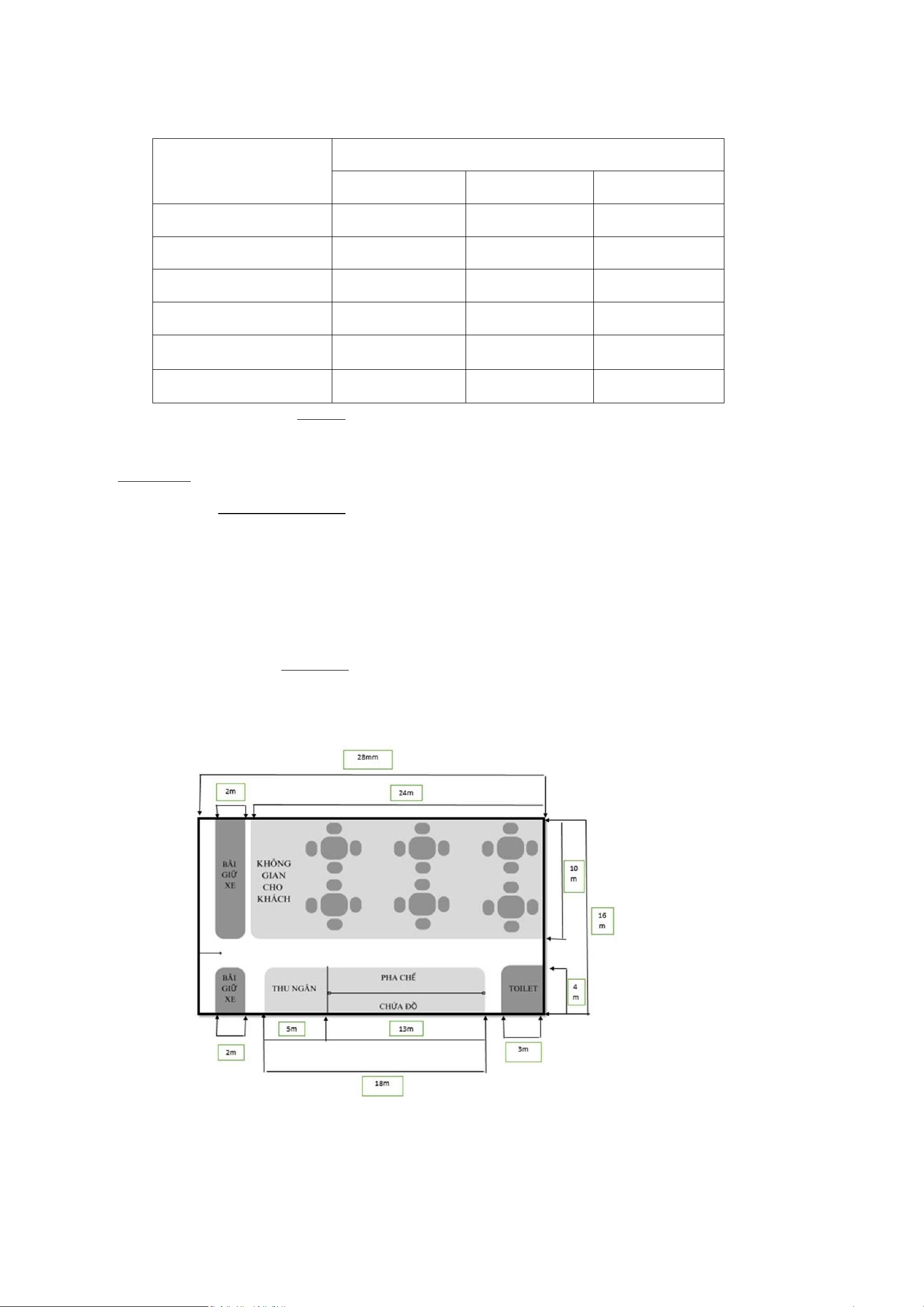Quầy thu ngân, chứa đồ, pha chế: 18m*4m= 72m2 Thu ngân: 5m*4m=20m2 Chứa đồ: 13m*2m= 26m2 Pha chế: 13m*2m=26m2 Bãi giữ xe 1: 10m*2m=20m2 Bãi giữ xe 2: 4m*2m= 8m2