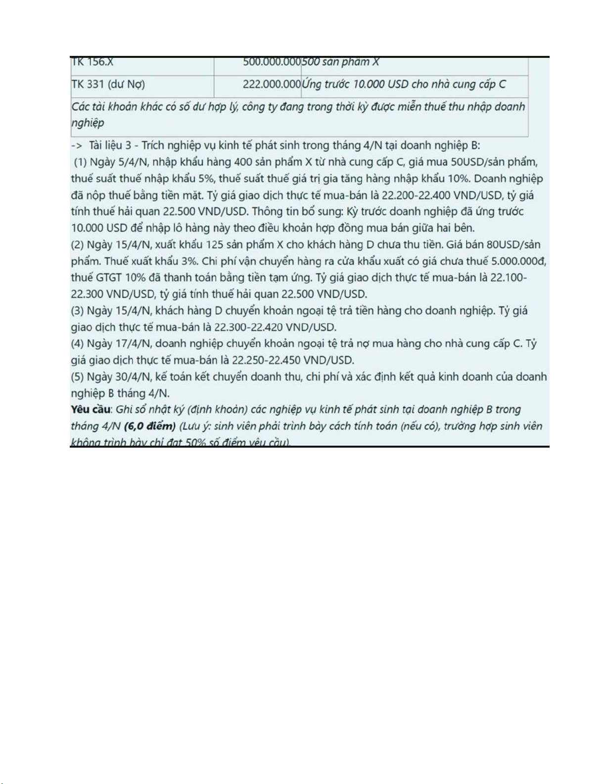 47.250.000 (20.000usd x 22.500đ x (1+5%) x 10%) lOMoARcPSD| 58854646 NỘP THUẾ = TK111 NỢ 3333 22.500.000 NỢ 33312 47.250.000 CÓ 111 69.750.000 NV2: Ngày 15/4/N SDĐK TK 156.X 500sp 500.000.000đ NK thêm 400sp 446.000.000đ