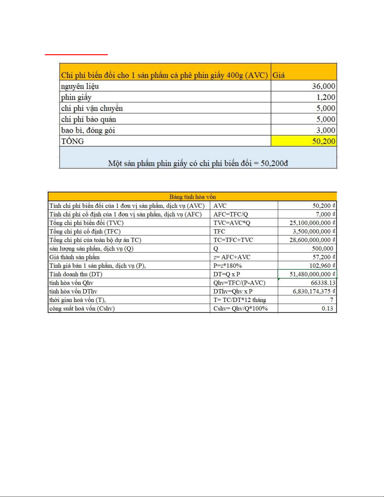 Bảng tính hoà vốn cho dự án