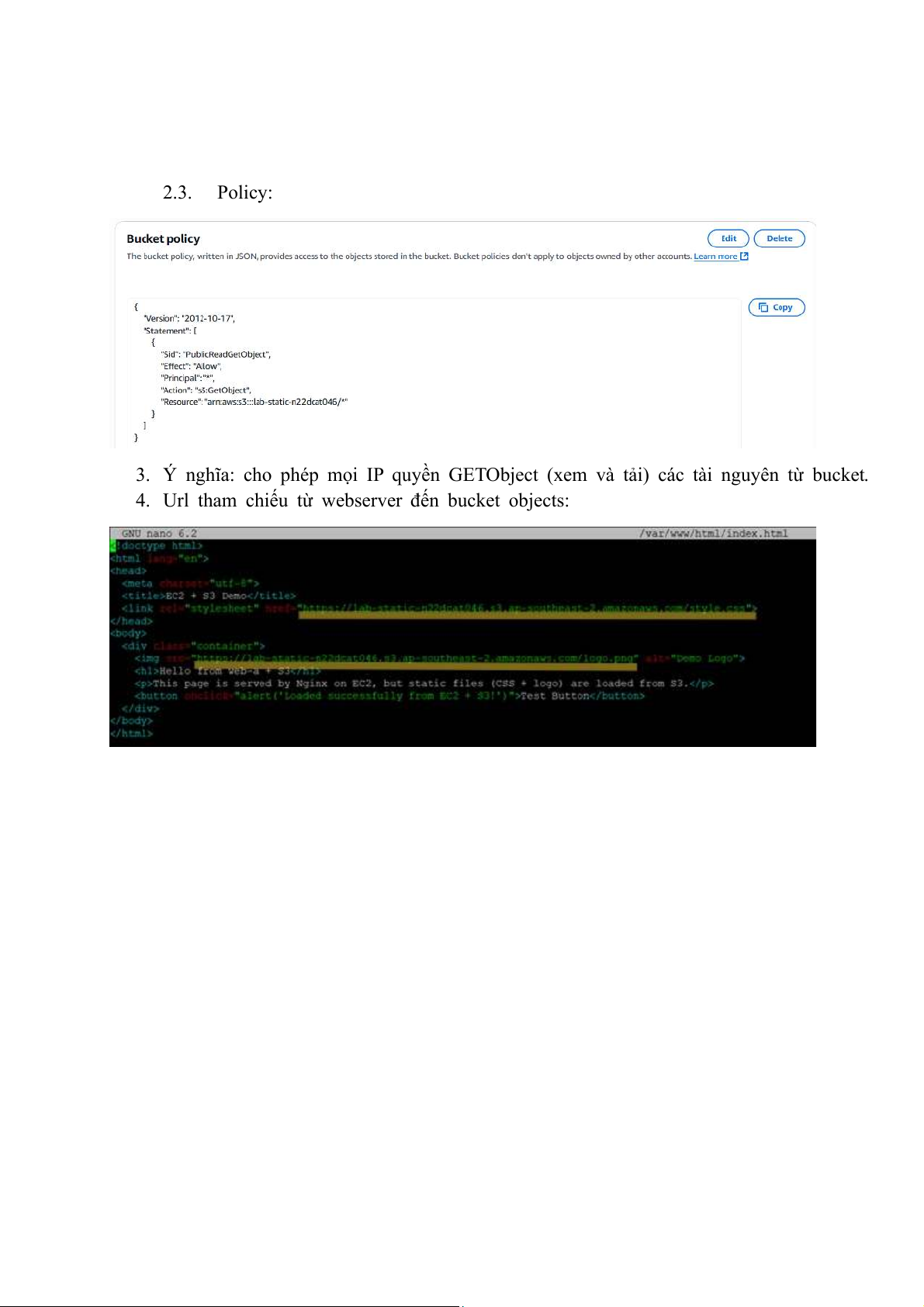 3. Ý nghĩa: cho phép mọi IP quyền GETObject (xem và tải) các tài nguyên từ bucket.