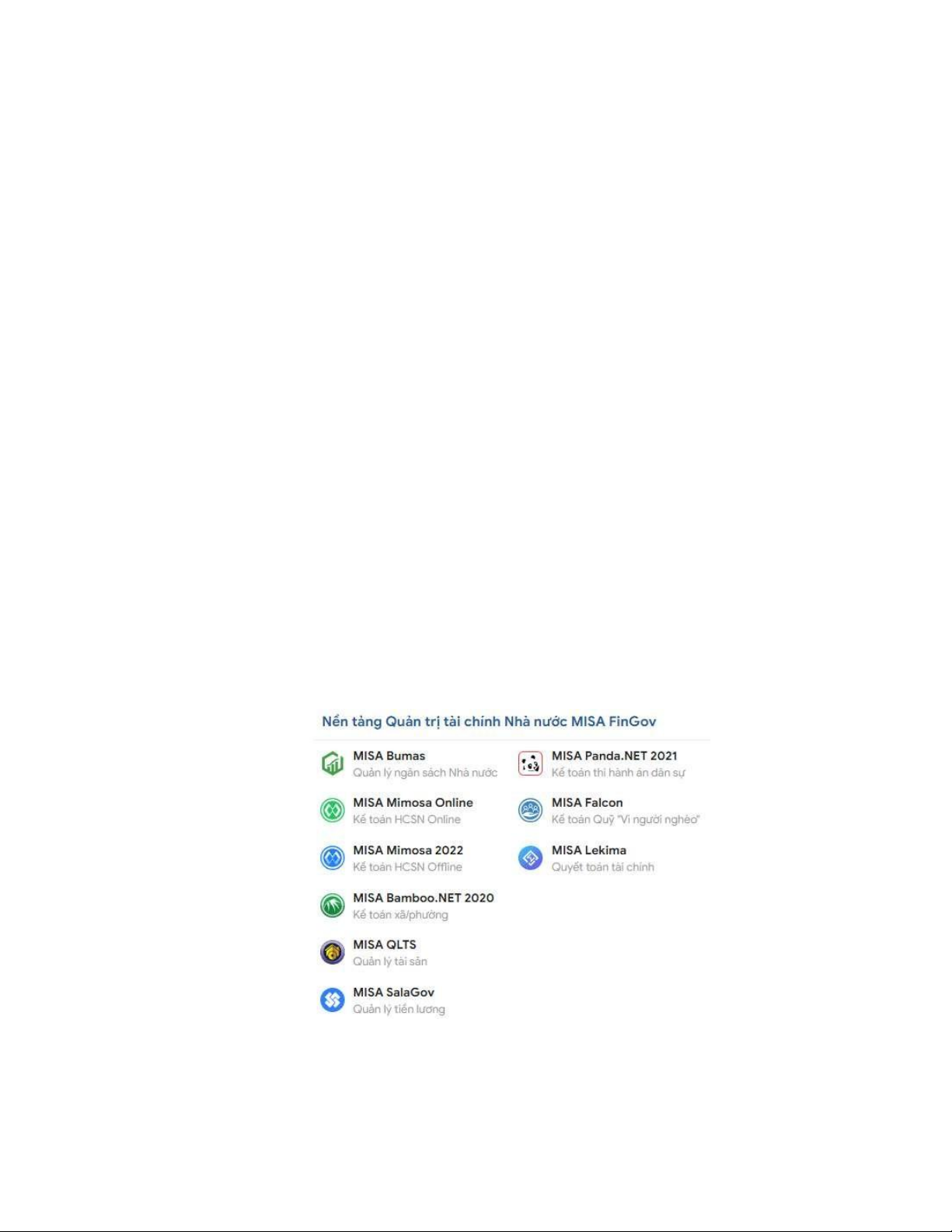 (Nguồn: misa.vn) Hình 1.4: Các phần mềm thuộc nền tảng Quản trị tài chính Nhà nước MISA  FinGov