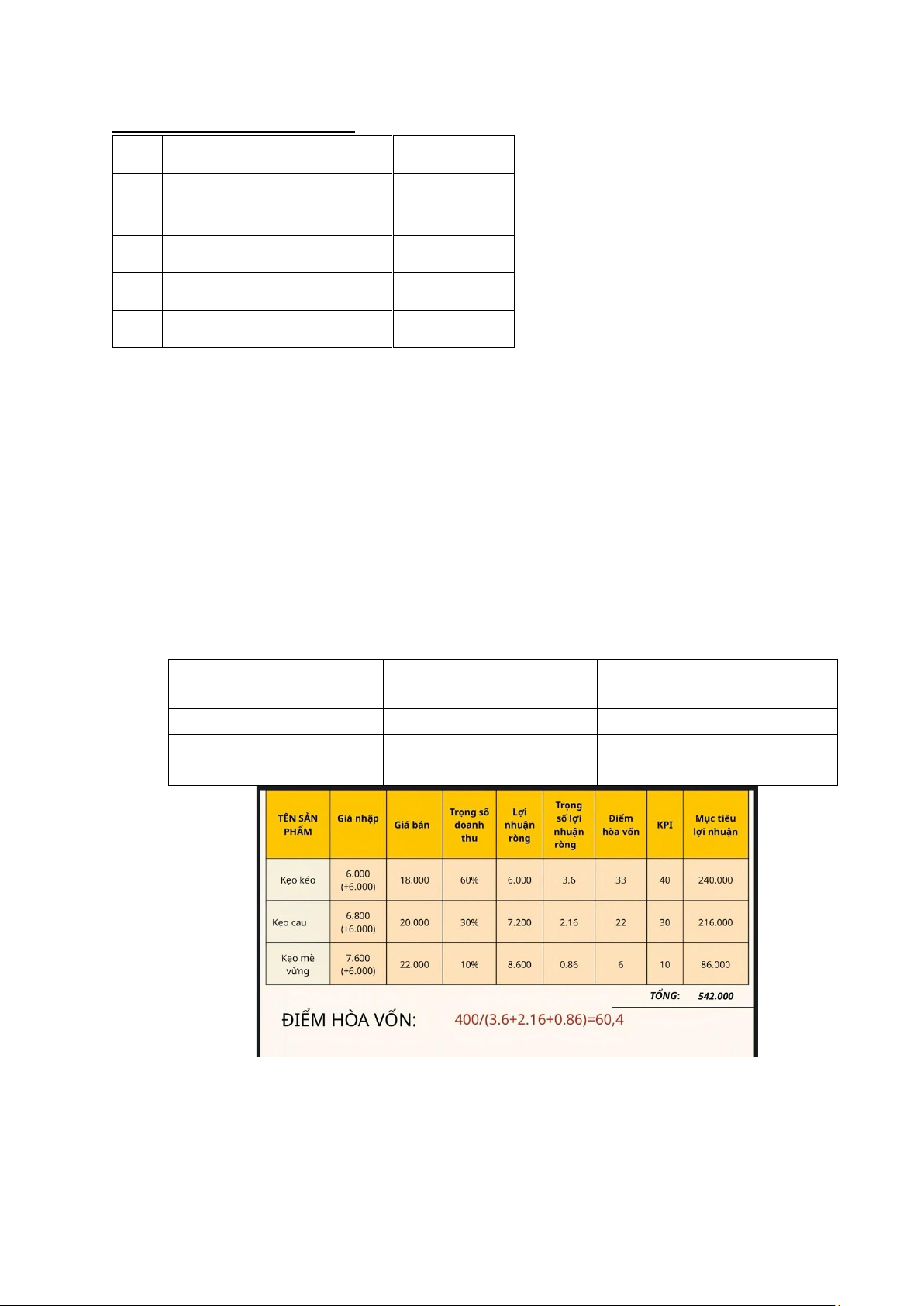 Số lượng đã bán – LỢI NHUẬN Sản phẩm Số lượng Lợi nhuận ròng TỔNG LỢI NHUẬN Kẹo kéo 21 6.000 +126.000 Kẹo cau 17 7.200 +122.400 Kẹo mè vừng 8 8.600 +68.800 CHI PHÍ QUẢNG -77.000 CÁO KHUYẾN MÃI