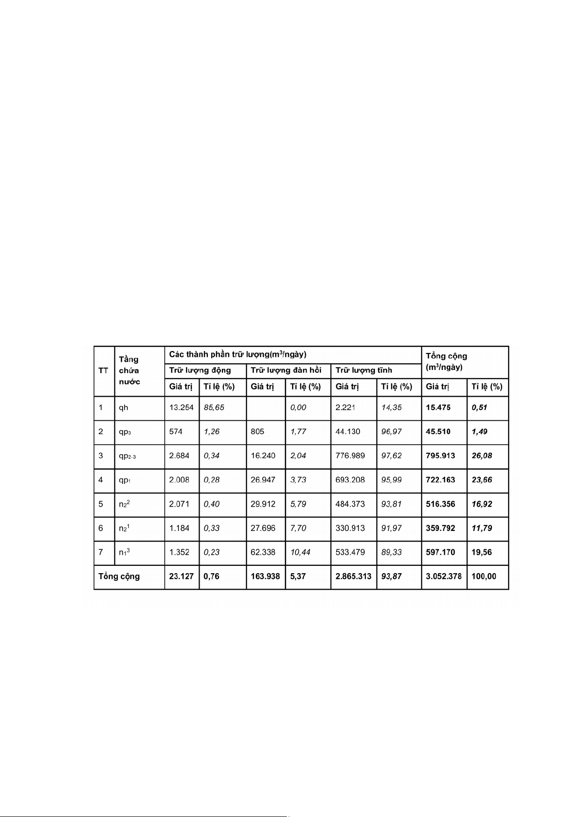 hồi là 168.938m3/ngày (chiếm tỉ lệ 5,37%) và trữ lượng động là 23.127m3/ngày (chiếm tỉ lệ 0,76%).