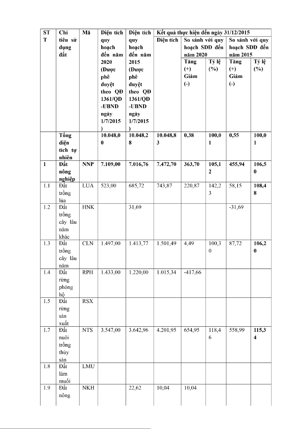 1.1.1.2 Đất trồng cây hàng năm HNK 59,76 -59,76 khác 1.1.2 Đất trồng cây lâu năm CLN 1501.50 1566,70 -65,2 1.2 Đất lâm nghiệp LNP 1015.34 1033,24 -17,9 1.2.1 Đất rừng sản xuất RSX 74,30 -74,30 1.2.2 Đất rừng phòng hộ RPH 1015.34 958,94 56,4 1.2.3 Đất rừng đặc dụng RDD 1.3