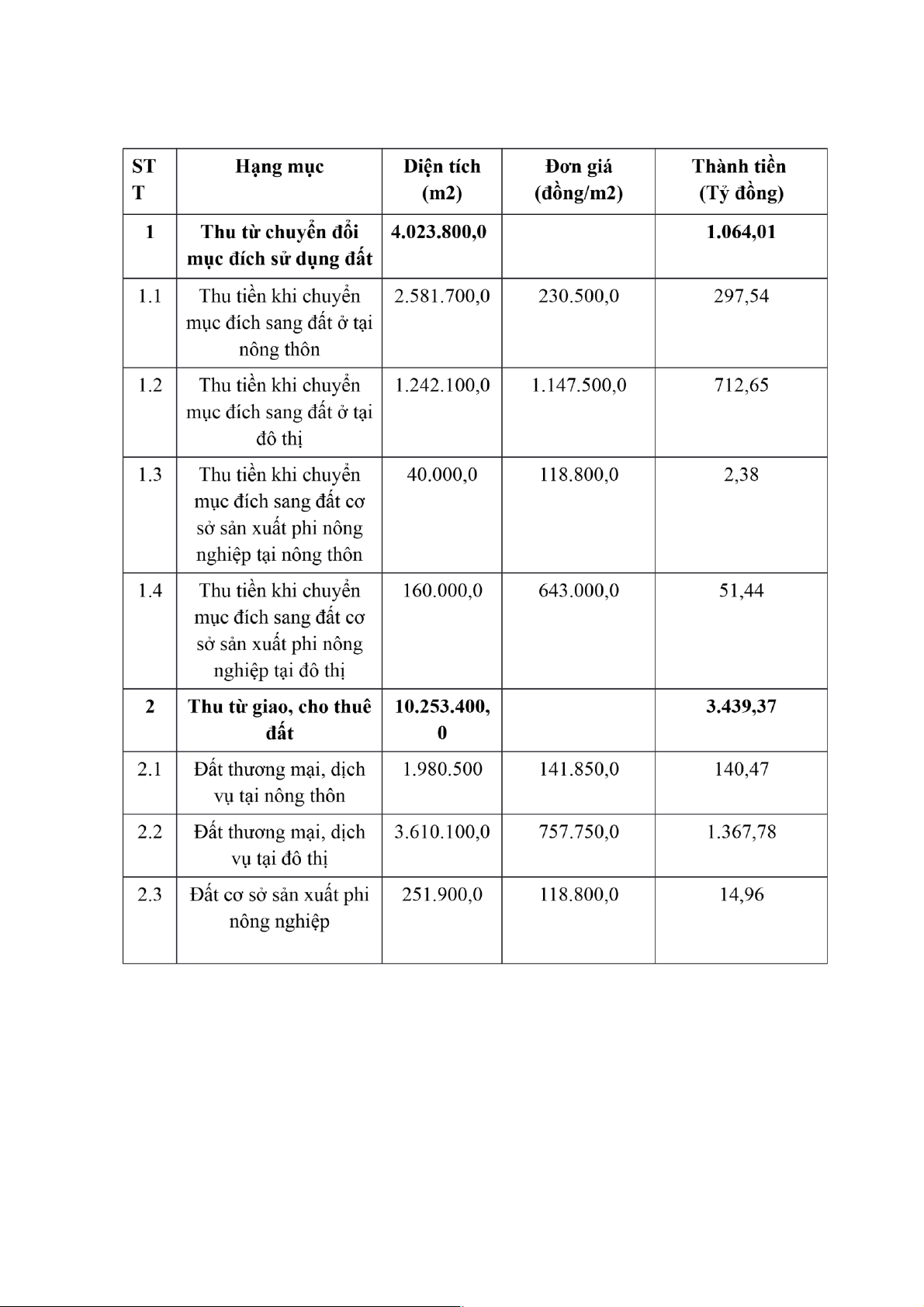 Dự kiến các nguồn thu từ giao đất, cho thuê đất, chuyển mục đích sử dụng
