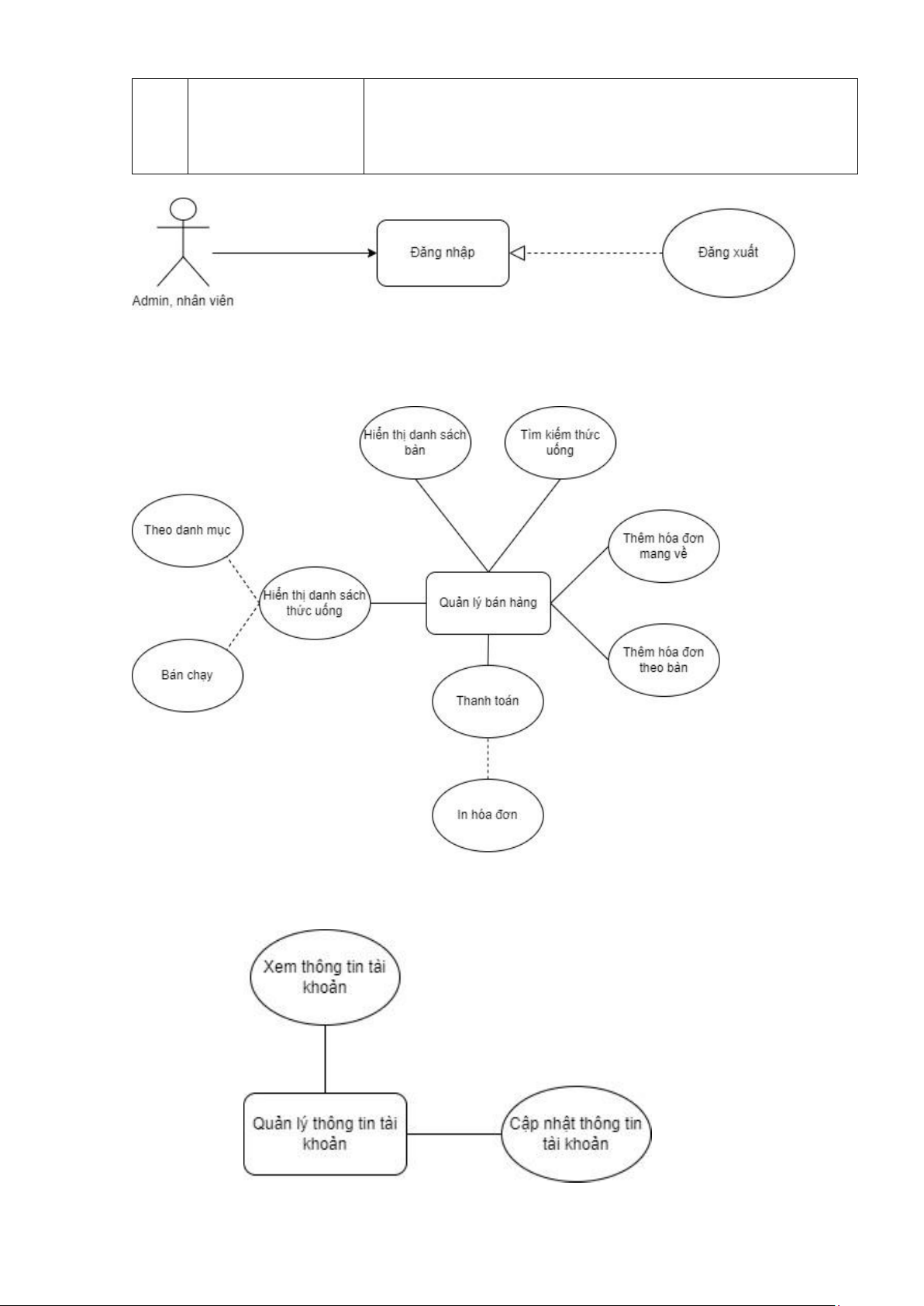 • Chủ quán, nhân viên và bếp, mỗi quyền sẽ có thể thực hiện các chức