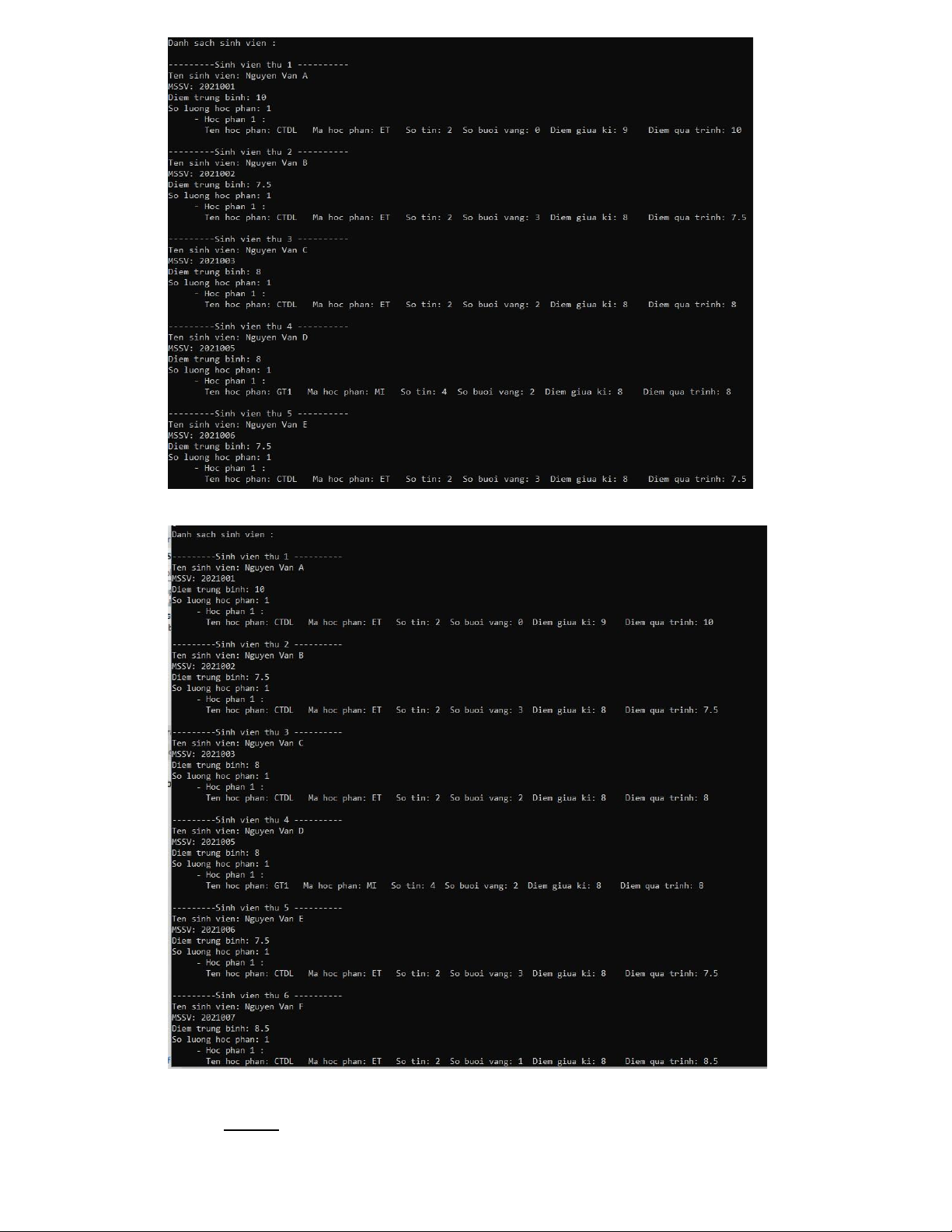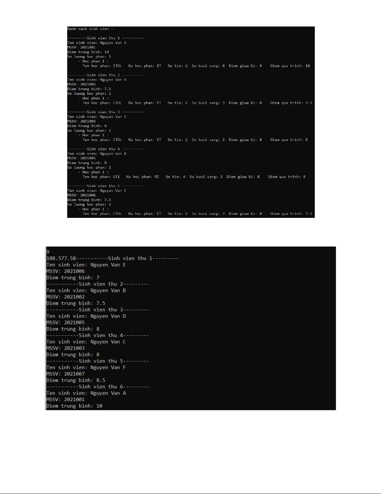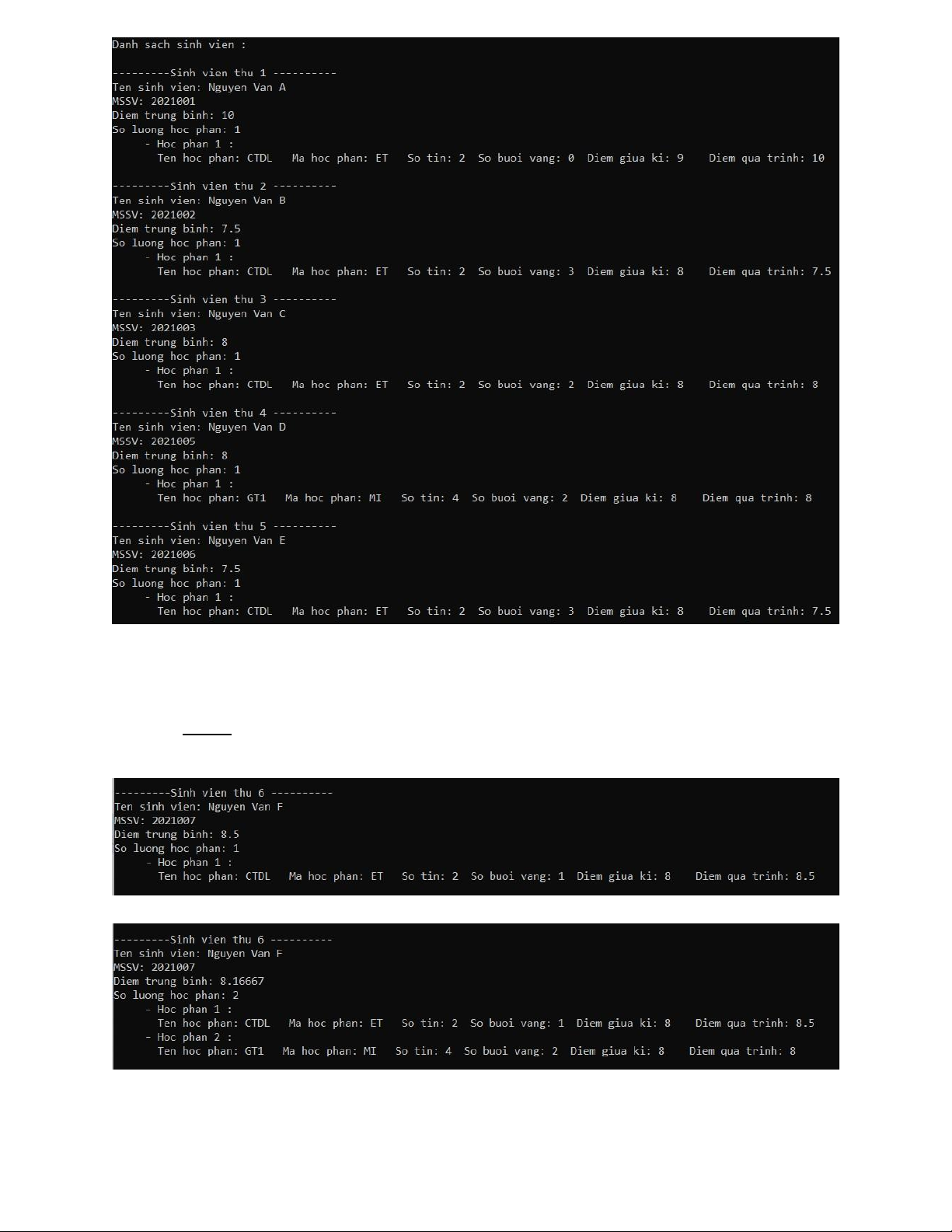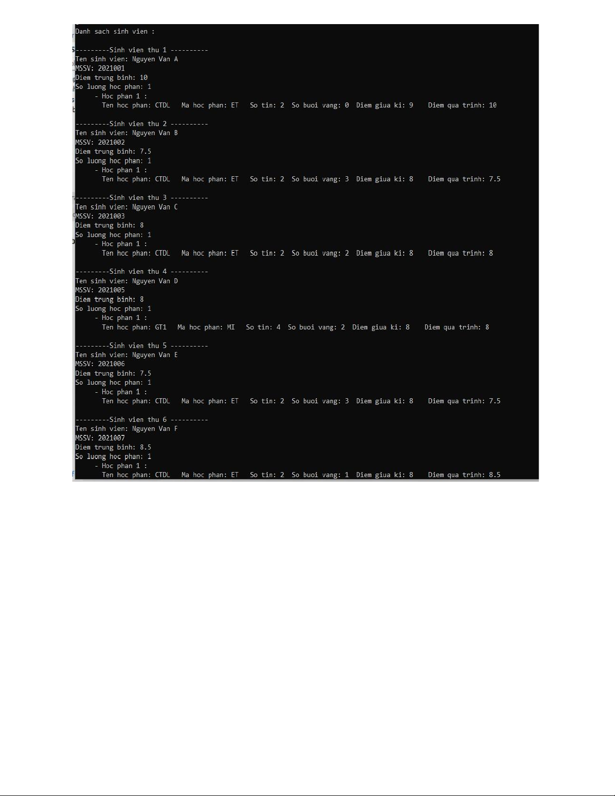 - Chức năng 9: In ra danh sách sinh viên theo thứ tự tăng dần của điểm trungbình giữa kì V. Kết luận