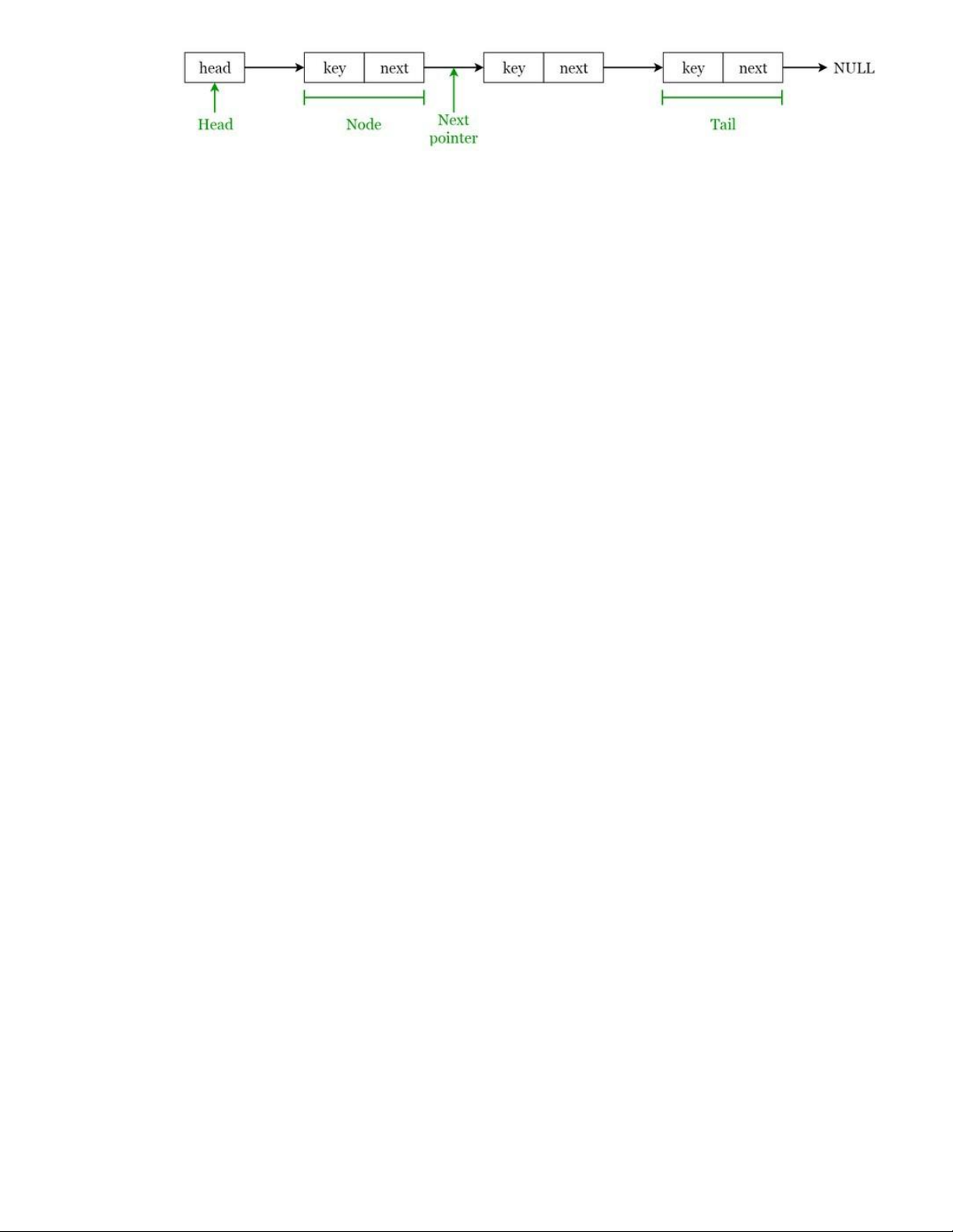 Mỗi node sẽ chưa một key và một con trỏ trỏ tới node kế tiếp của nó, được gọi là next •