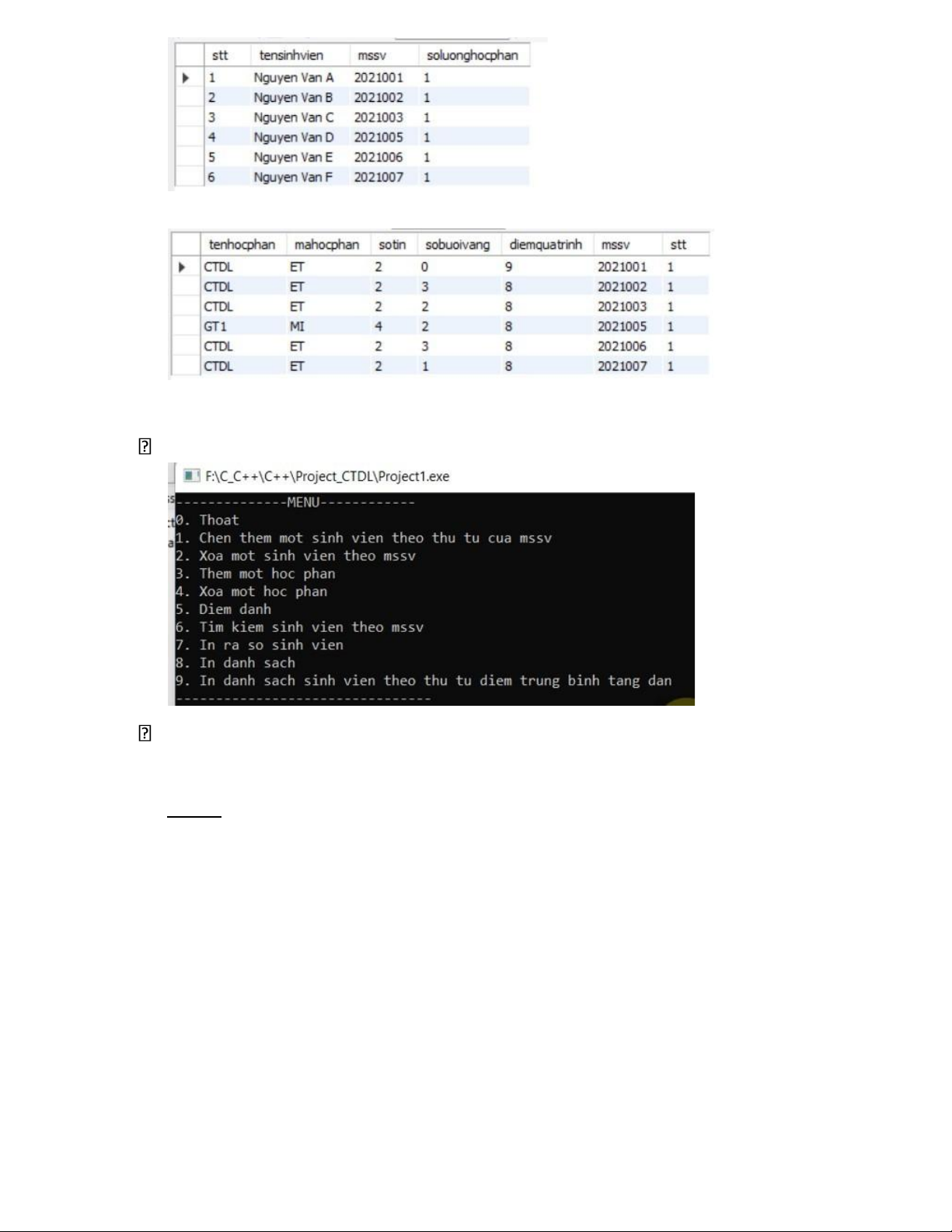 - Chức năng 5 : Tăng số buổi vắng thuộc học phần CTDL của sinh viên