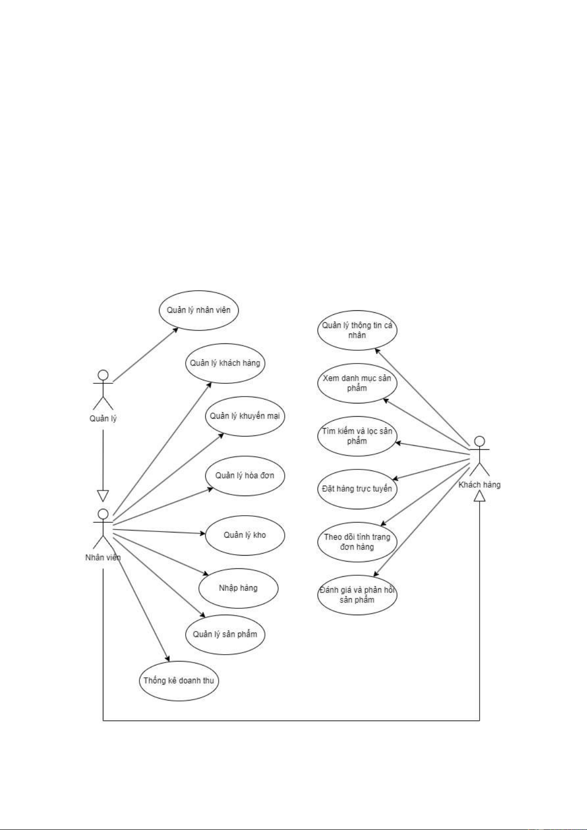 Các chức năng của hệ thống: Người quản lý: Quản lý nhân viên. Nhân viên: Quản lý khách hàng. Quản lý khuyến mại Quản lý hóa đơn. Quản lý kho. Nhập hàng. Quản lý sản phẩm. Thống kê doanh thu. Khách hàng: Đăng ký tài khoản. Đăng nhập.