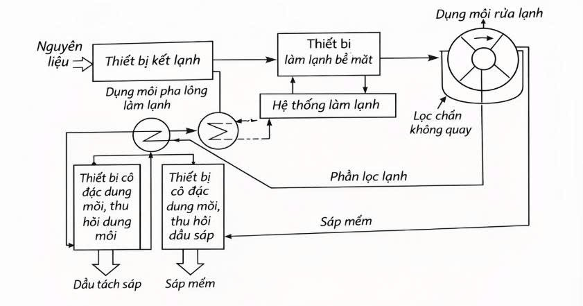 Quy trình thứ nhất: làm lạnh để kết tinh sáp và dùng dung môi để hòa tan thành phần dầu đủ cho phép lọc nhanh để tách sáp khỏi dầu.