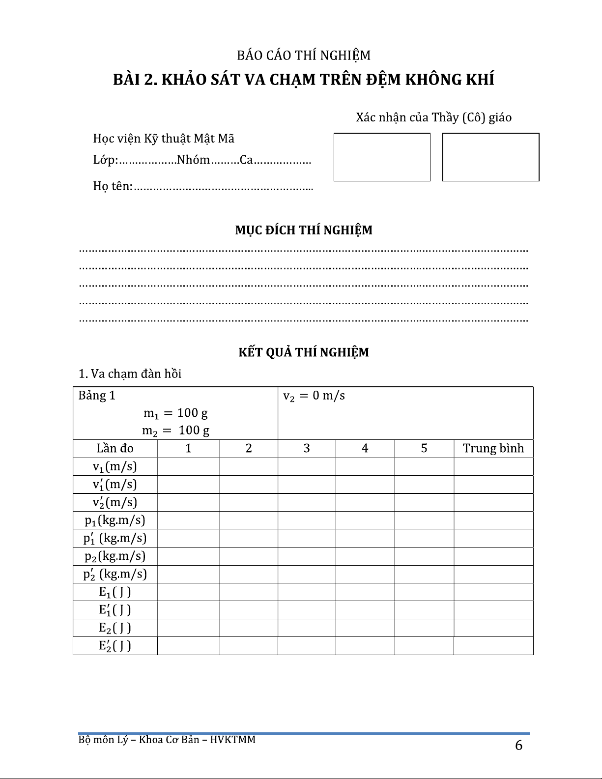 Báo cáo thí nghiệm Bài 2. Khảo sát va chạm trên đệm không khí môn Vật lý đại cương | Học viện Kỹ thuật mật mã