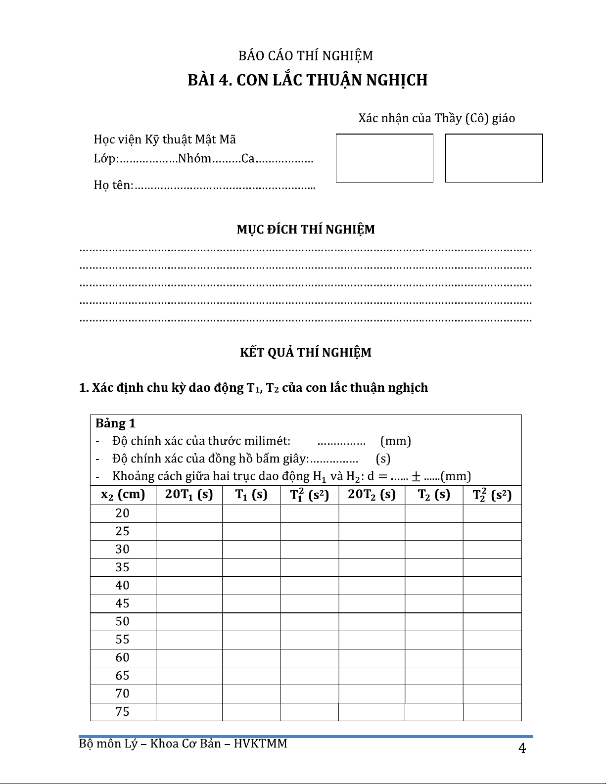 Báo cáo thí nghiệm Bài 4. Con lắc thuận nghịch môn Vật lý đại cương | Học viện Kỹ thuật mật mã