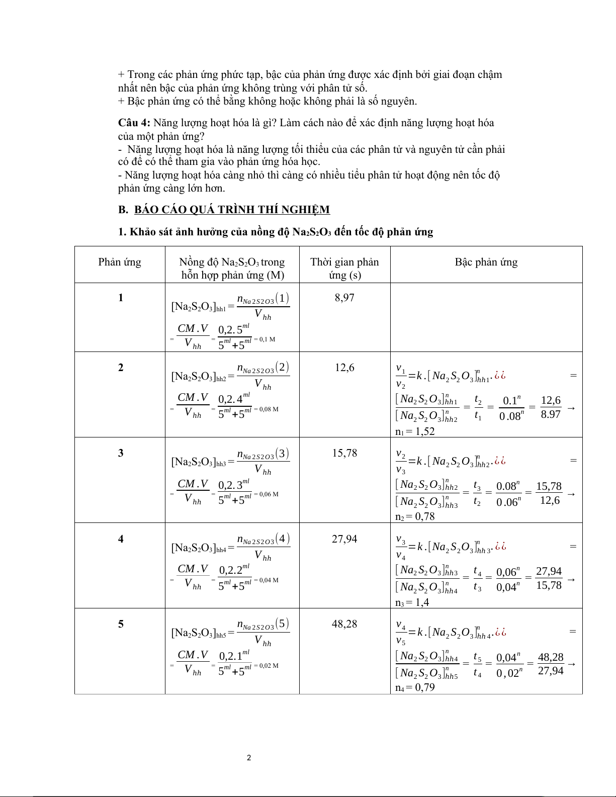 Na 2 S 2 O 3 1 n 2S O 2 3]hh2 = =k .[ Na S O ] . ¿ ¿ = V v 2 2 3 ℎℎ1 ℎℎ 2 CM .V 0,2. 4ml [ Na S O ]n t 2 2 3 ℎℎ1 2 12,6 = = = 0.1n = V = → n ℎℎ