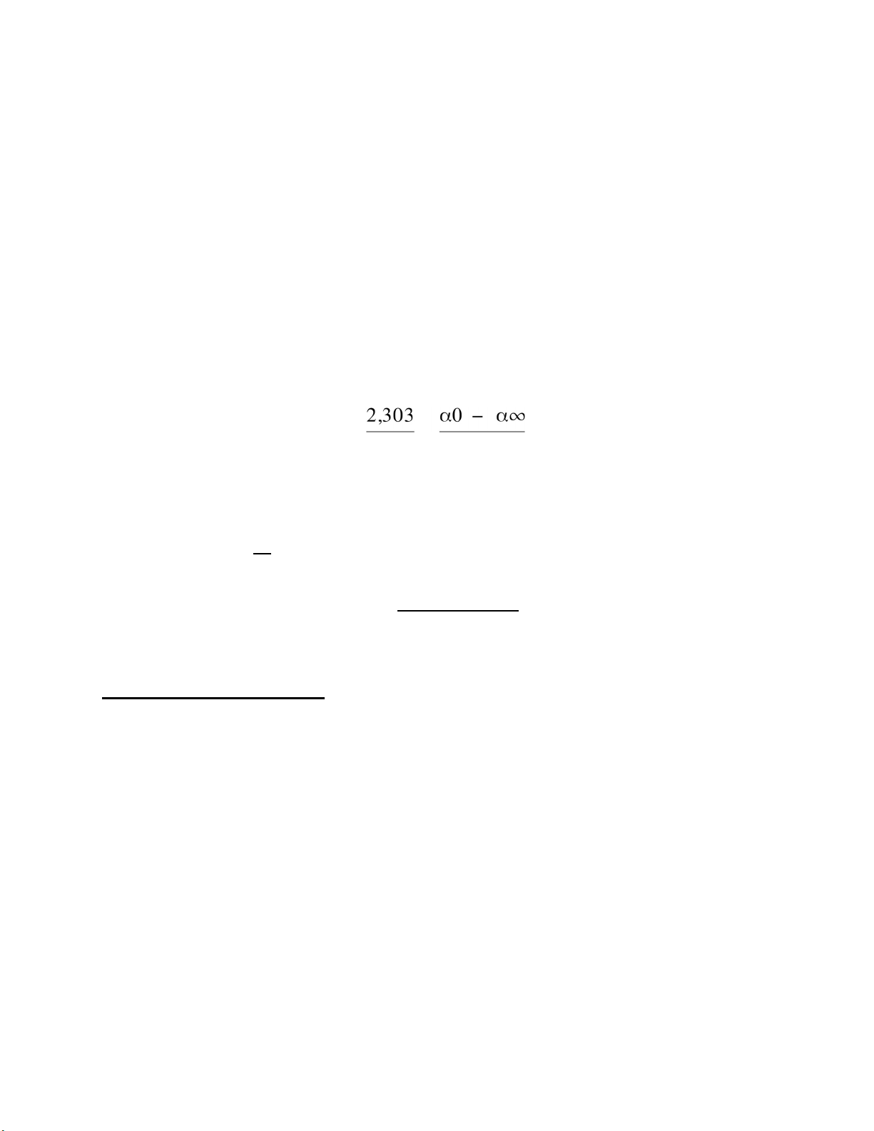 - Nhiệt độ phòng thí nghiệm: 30oC Thời gian 2.303/t α αt-α∞ k (phút) 0 ∞ 2,85 12,1 0,0000 3 0,7677 2,5 11,75 0,0098 6 0,3838 2,15 11,4 0,0099 10 0,2303 1,05 10,3 0,0161 lOMoAR cPSD| 59062190 15 0,1535 -1,30 7,95 0,0280 25 0,0921 -4,35 4,9 0,0362 40 0,0576 -7,25 2 0,0405 60 0,0384 -7,55 1,7 0,0400 T=∞ 0,0000 -9,25 0,0000 0,0000 Giá trị trung bình k= =0,0264 2,303 0,693 0,693