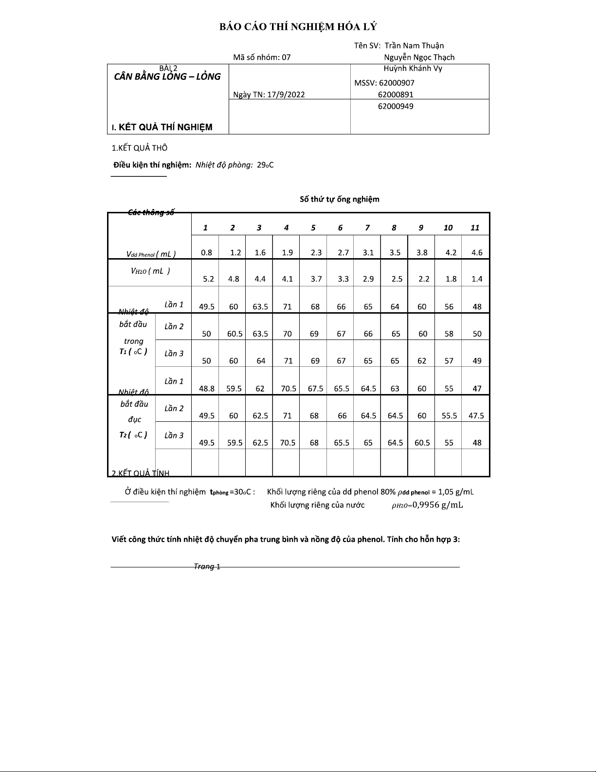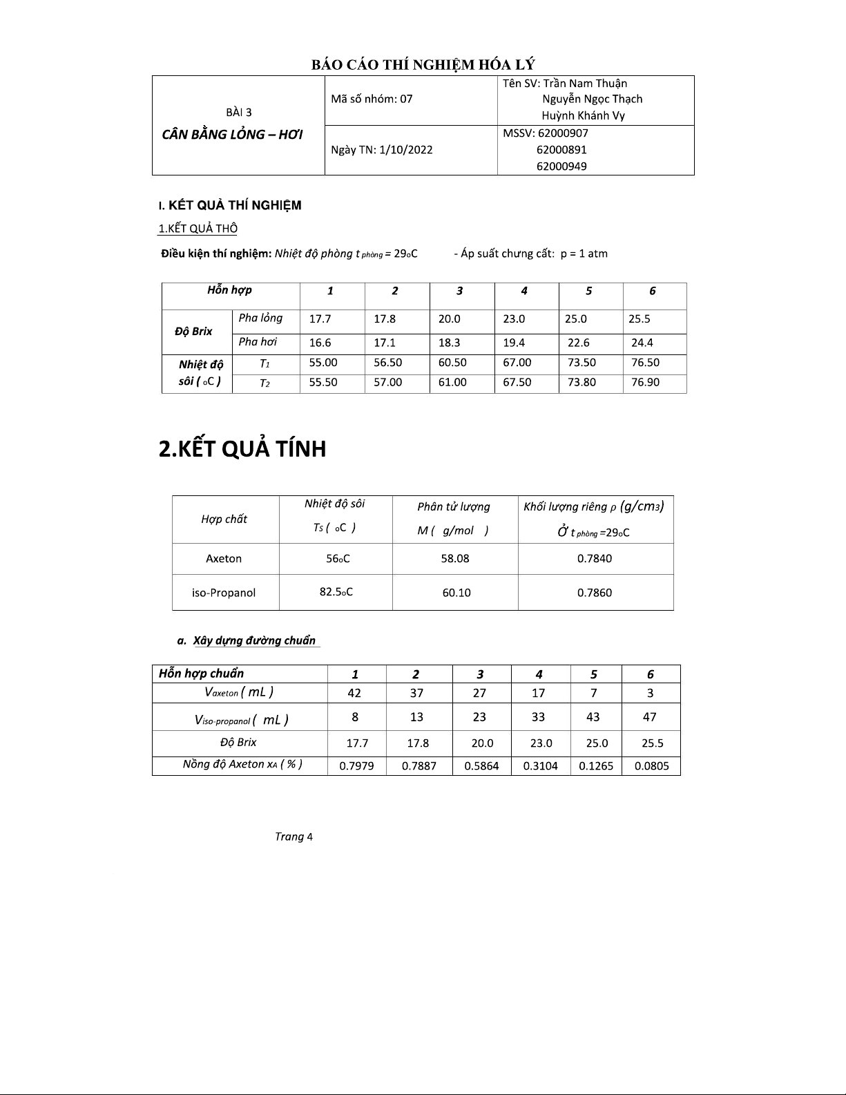 Báo cáo Thí nghiệm Hóa lý - Các Bài 1-5 (Mã nhóm: 07)