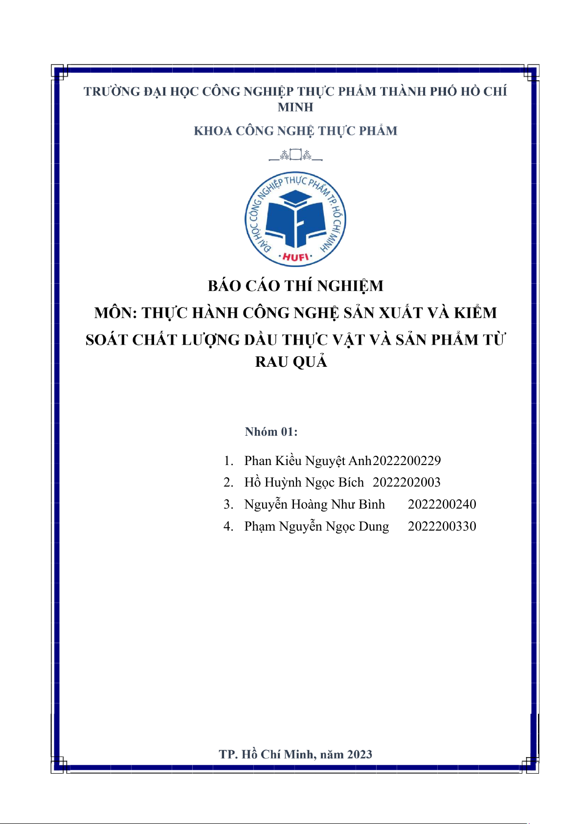 1.4. SỐ LIỆU THỰC NGHIỆM.....................................................................8 Bài 2: KIỂU TRA CHỈ TIÊU CHẤT LƯỢNG DẦU