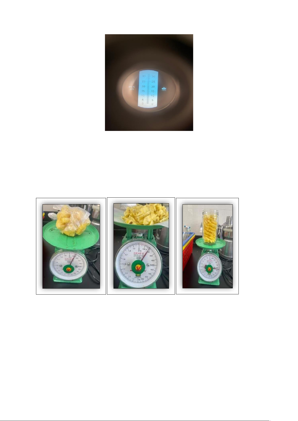 3.3. Dụng cụ và thiết bị STT Hóa chất Đơn vị Số lượng 1 Thau nhựa Cái 1 2 Nồi inox Cái 1 3 Bếp gas Cái 1 4 Muỗng Cái 1 5 Ống đong Cái 1 6 Dao inox lớn, nhỏ Cái 1 7 Dao đột lõi Cái 1 8 Dao châm mắt lưới Cái 1 9 Thớt Cái 1 10 Cốc nhựa 500ml Cái 1 11 Pipet 5ml Cái 1 12 Nhiệt kế Cái 1 THIẾT BỊ 1 Cân Cái 1 2 Chiết quang kế Cái 1 3 Nồi thanh trùng Cái 1 3.1. Thực nghiệm