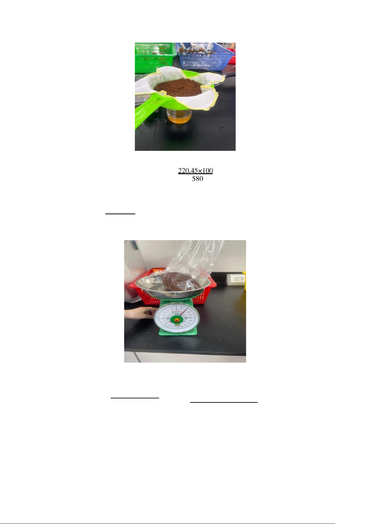 1.2.2. Hóa chất, dụng cụ và thiết bị STT Hóa chất Quy cách Đơn vị Số lượng 1 Cồn 98o ml 100 2 KOH trong cồn 0.1N ml 30 3 Phenolphtalein 1% ml 10 DỤNG CỤ STT Dụng cụ Quy cách Đơn vị Số lượng 1 Nồi inox 5 lít Cái 1 2 Bếp gas Cái 1 3 Muỗng lớn Cái 1 4 Rây Cái 1 5 Thau nhựa 5 lít Cái 1 6 Vải lọc Miếng 1 7 Chảo Cái 1 8 Bình tam giác 150ml Cái 3 9 Pipet 1ml-10ml Cái 1 10 Buret Cái 1 11 Bóp cao su Cái 1 12 Bình tia Cái 1 13 Giá gỗ Cái 1 14 Cốc thủy tính 50ml Cái 1 15 Nhiệt kế Cái 1 THIẾT BỊ 1 Cân kỹ thuật 2 số lẻ Cái 1 2 Cân sấy hồng ngoại Cái 1 3 Cân Cái 1 1.2.3. Thực nghiệm