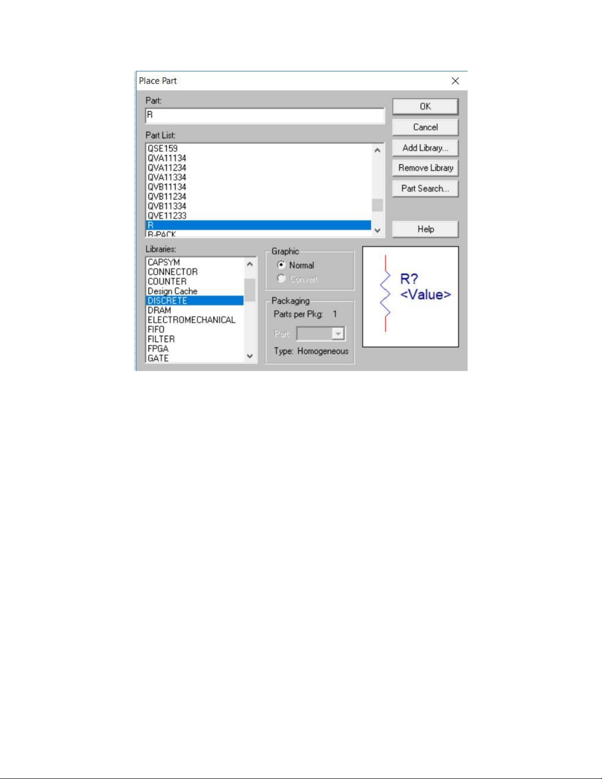Để lấy linh kiện như điện trở R,ta chọn vào thư viện DISCRETE và nhập R vào ô Part