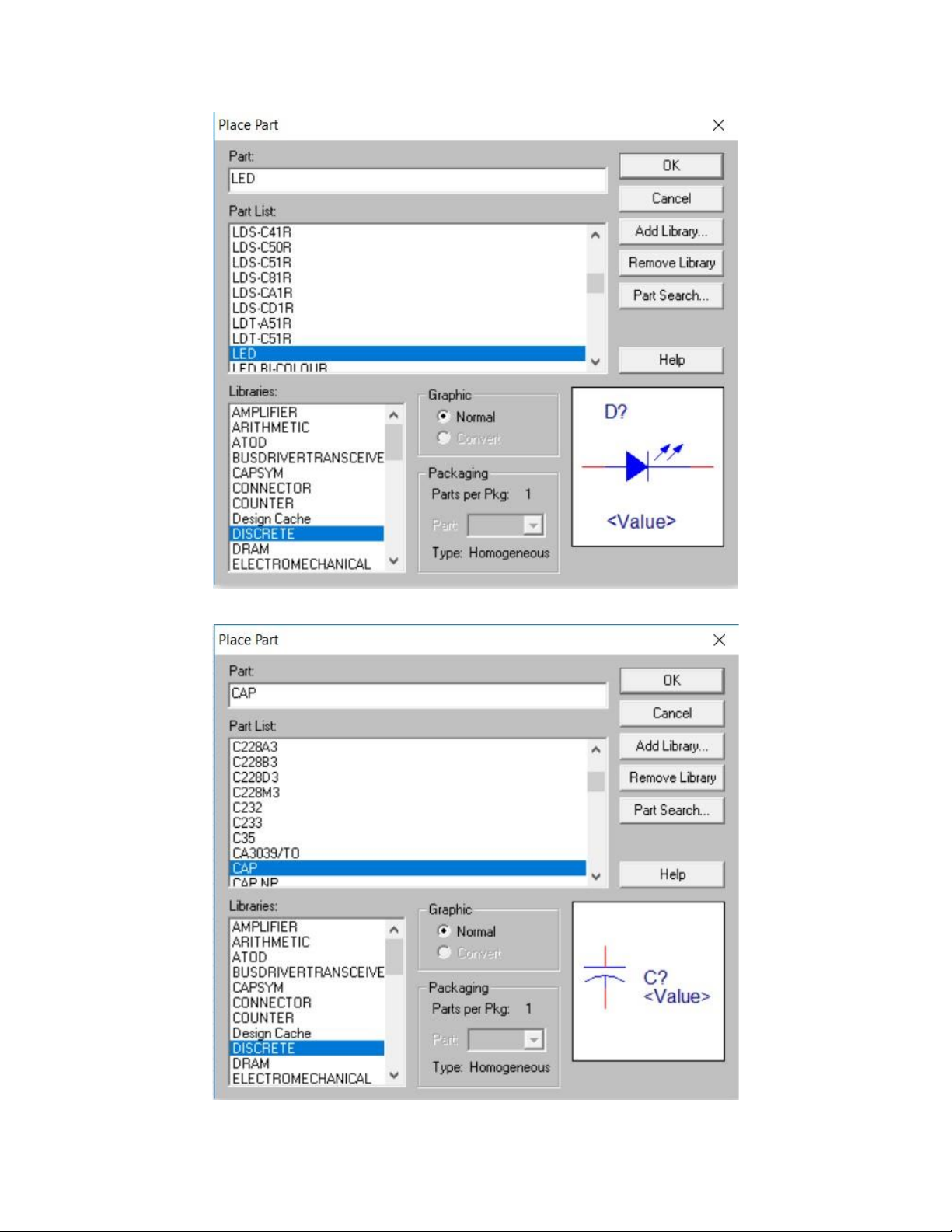 chân có sẵn trong thư viện. Nhấp vào Create... để tạo chân mới hoặc chỉnh sửa các linh kiện có sẵn Linh kiện Tên Thư viện Điện trở AX/.350X.100/.031 TM_AXIAL Tụ điện CYL/D.150/LS.125/.031 TM_CYLND Transistor TO225AA TM_CYLND Đèn LED AX/.350X.100/.034 TM_AXIAL