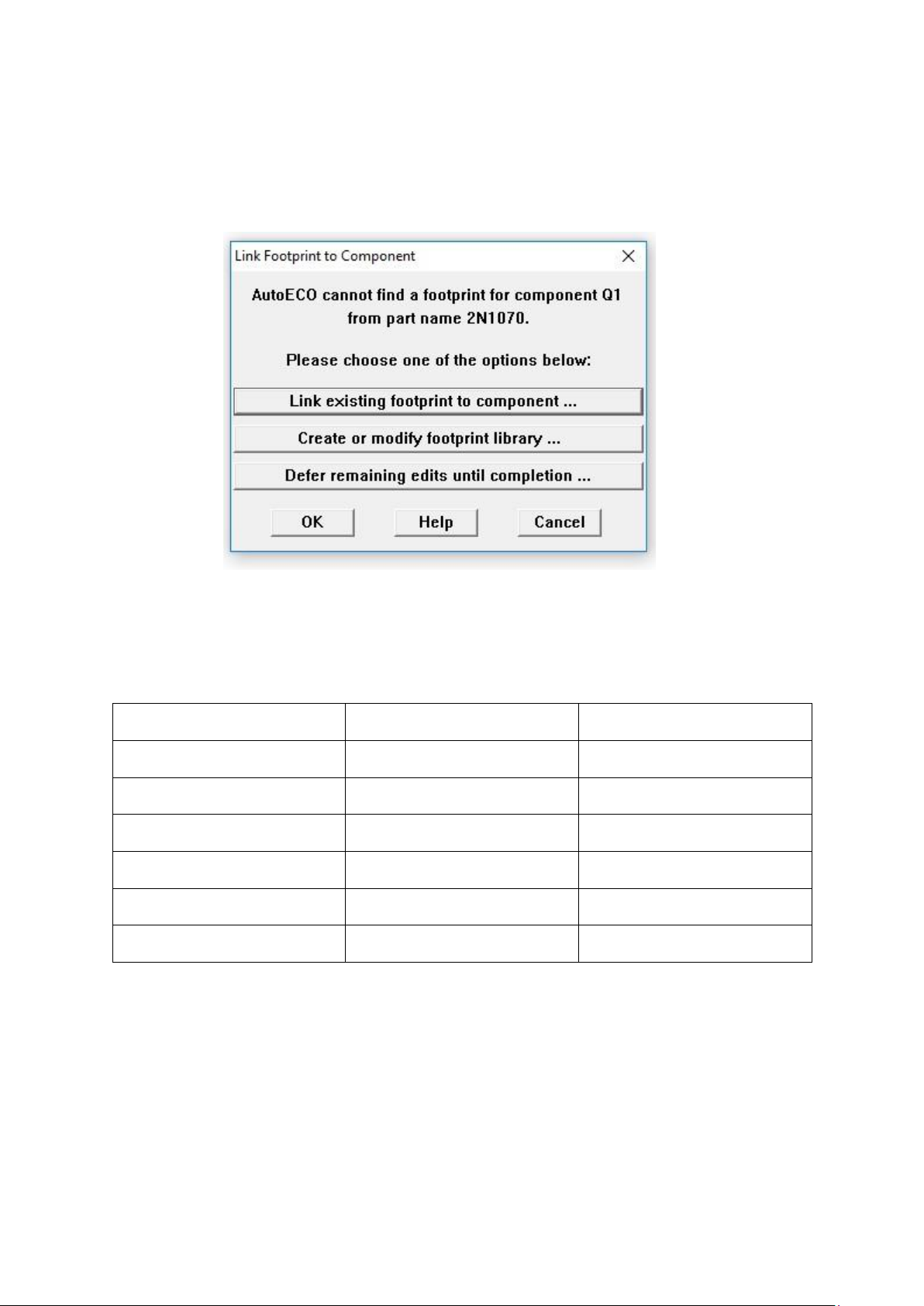 Ta chọn Link existing footprint to component… để tìm chân đế, ta tìm chân đế theo bảng sau Mã linh kiện Library Footprints R JUMPER JUMPER100 RESISTOR VAR JUMPER JUMPERVAR RESISTOR VAR 2 JUMPER JUMPER100 2N1070 VRES VRES13 LED TM_DIODE DAX2/SOD64 CON2 JUMPER JUMPER100
