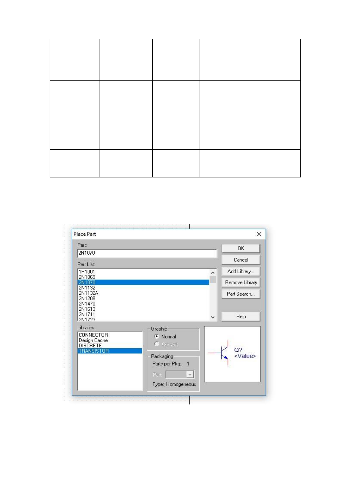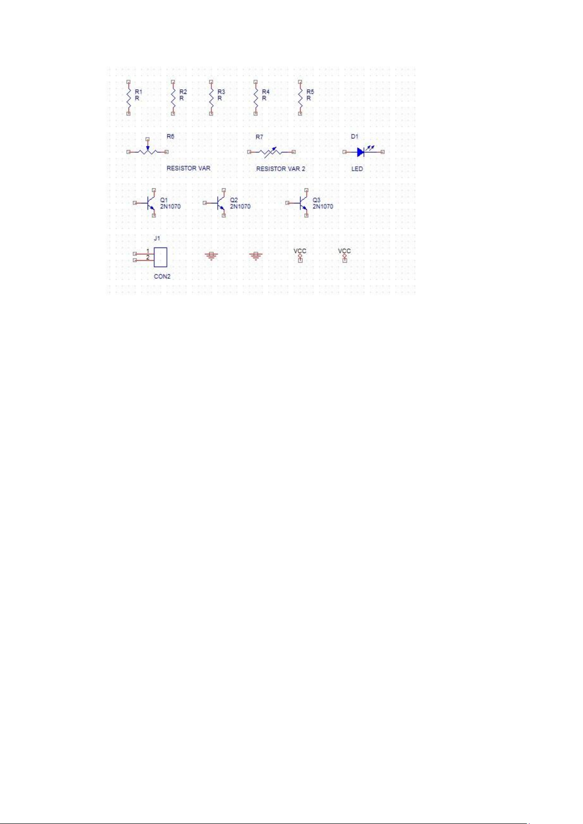 Ta lựa chọn linh kiện theo bảng sau Tên linh Part Part list Library Số lượng kiện lOMoAR cPSD| 61531195 Điện trở R R DISCRETE 5 Biến trở RESISTOR RESISTOR DISCRETE 1 VAR VAR Quang trở RESISTOR RESISTOR DISCRETE 1 VAR 2 VAR 2 Diode 2N1070 2N1070 TRANSISTO 3 R LED LED LED DISCRETE 1 Chân cắm CON2 CON2 CONNECTO 1 R