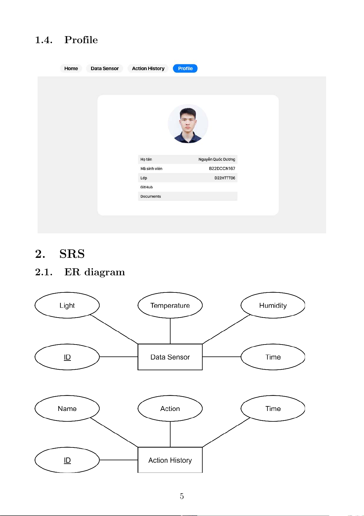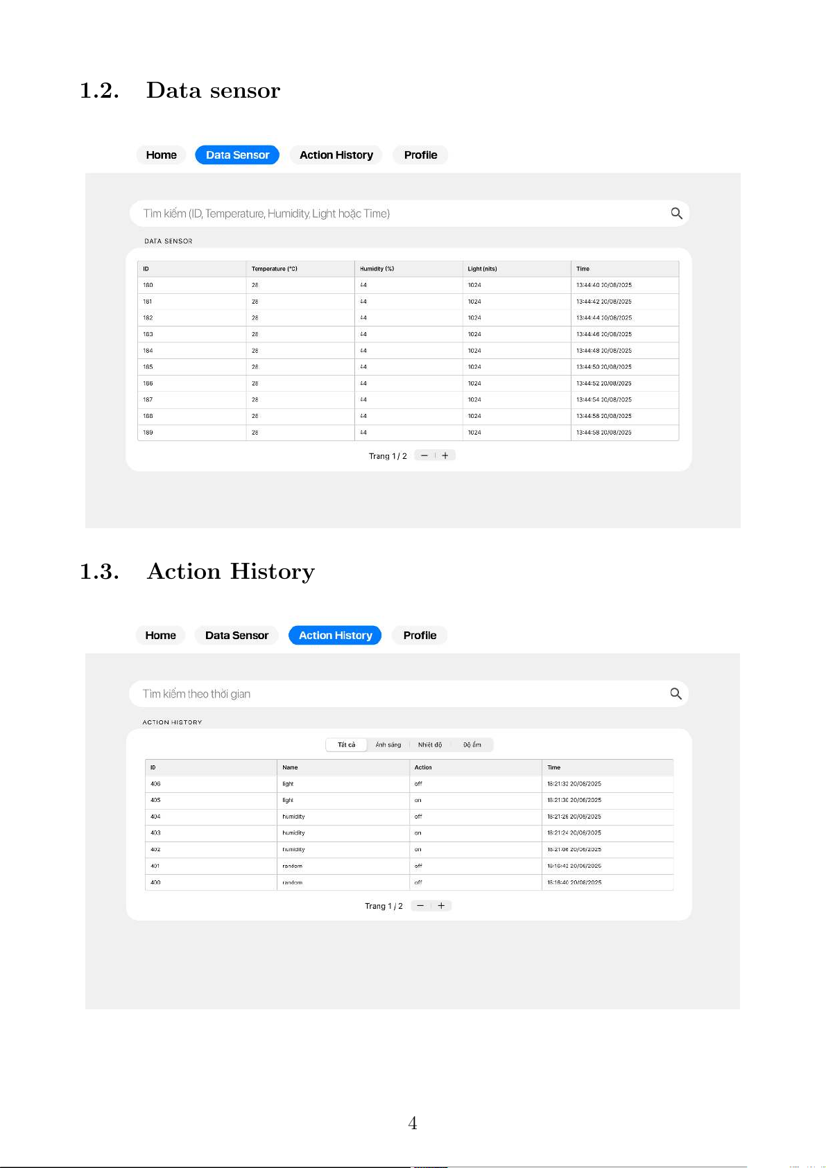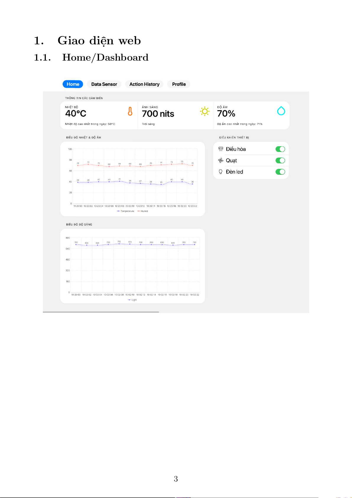 Sequence Diagram . . . . . . . . . . . . . . . . . . . . . . . . . . . 7 2 1. Giao diện web 1.1. Home/Dashboard 3 1.2. Data sensor 1.3. Action History 4 1.4. Profile 2. SRS 2.1. ER diagram 5 2.2. Activity Diagram 6 2.3. Sequence Diagram 7