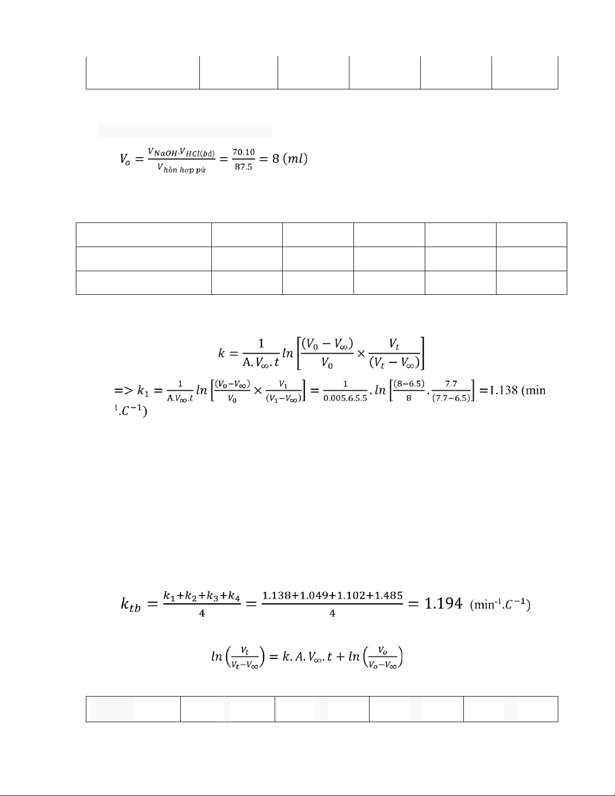 Còn V0, Vt, V là thể tích NaOH 0,05N còn lại trong mẫu thử (10ml) tại các thời điểm t = 0, t, .