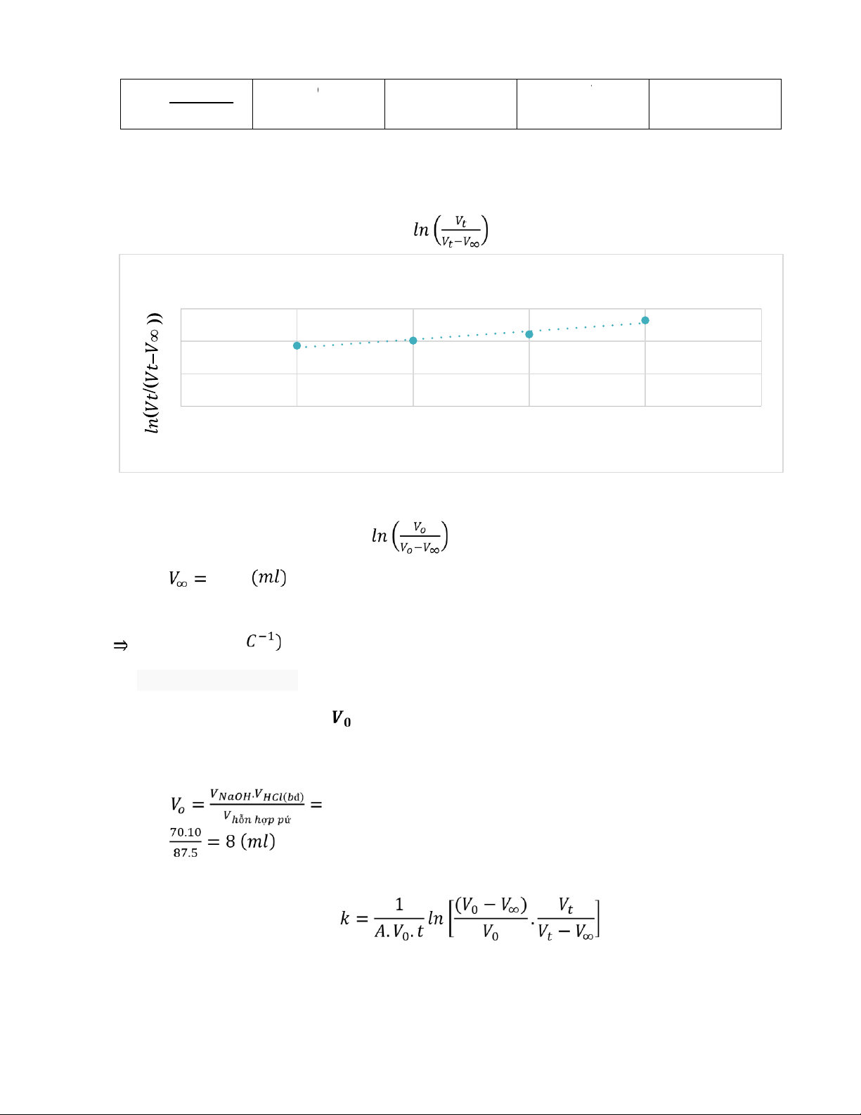𝑙 𝑛 ( 𝑉 𝑡 /( 𝑉 𝑡 − 𝑉 ∞ ))= f(t) 3 2 y = 0,0507x + 1,5468 R² = 0,9405 1 0 0 5 10 15 20 25 t (Phút)