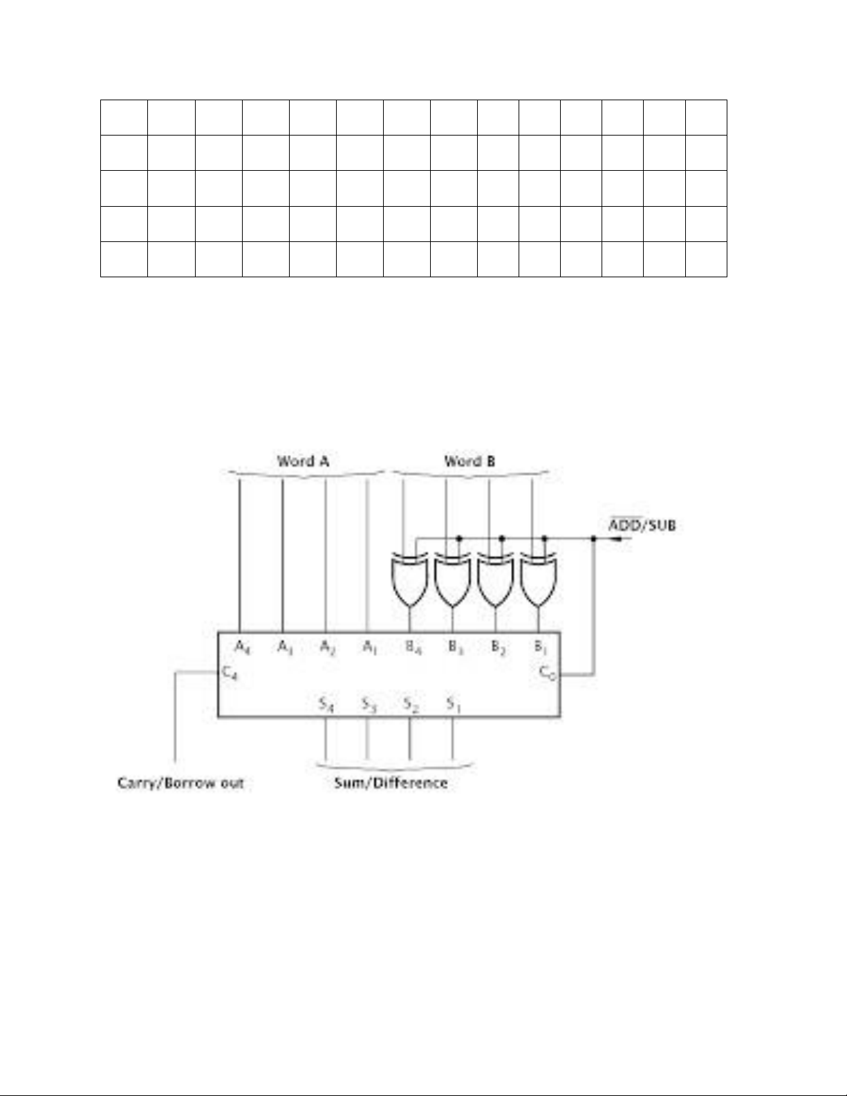1.2. Mạch trừ nhị phân 4 Bit a) Sơ đồ thiết kế b) Sơ đồ lắp ráp lOMoAR cPSD| 59691467 c) Bảng trạng thái Đầu vào Đầu ra A4 A3 A2 A1 B4 B3 B2 B1 C0 S4 S3 S2 S1 C4 0 0 1 0 0 0 1 1 1 1 1 1 0 0 0 1 1 1 0 1 1 0 1 0 0 0 0 1 1 0 0 0 0 1 1 1 1 0 0 0 0 1 1 0 1 0 1 1 0 0 1 1 1 0 1 0 1 1 1 1 1 0 1 0 1 0 1 0 0 1 d) Phương trình Si = Ai ⊕B ̅ i ⊕ Ci