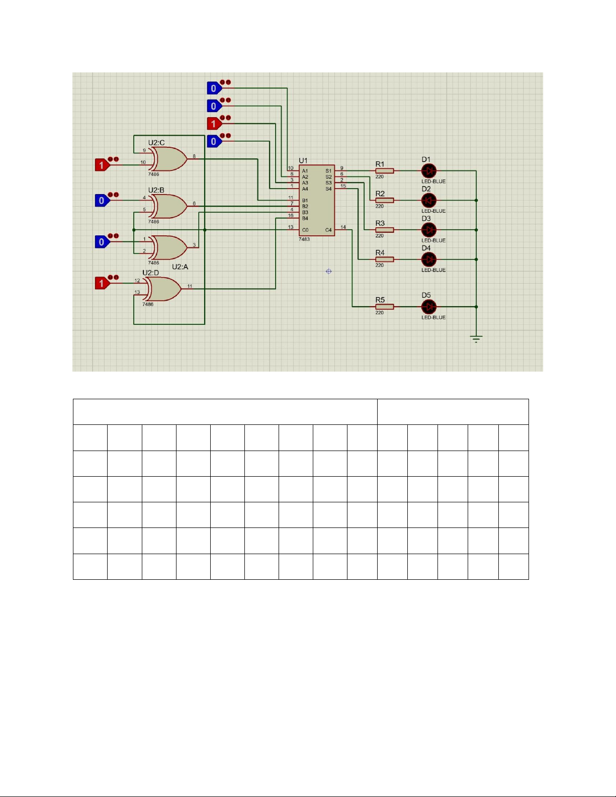 1.1. Mạch cộng nhị phân 4 Bit a) Sơ đồ thiết kế lOMoAR cPSD| 59691467 b) Sơ đồ lắp ráp c) Bảng trạng thái Đầu vào Đầu ra A4 A3 A2 A1 B4 B3 B2 B1 C0 S4 S3 S2 S1 C4 0 0 0 0 0 0 0 0 0 0 0 0 0 0 0 0 0 1 0 0 0 1 0 0 0 1 0 0 lOMoAR cPSD| 59691467 0 0 1 0 0 0 0 1 0 0 0 1 1 0 0 1 0 0 0 0 1 1 0 0 1 1 1 0 0 1 1 1 0 0 0 1 0 0 0 0 0 0 1 1 1 1 0 0 0 1 0 0 0 0 0 1 1 0 1 0 0 1 0 1 1 0 0 0 0 1 d) Phương trình Si = Ai ⊕ Bi ⊕ Ci
