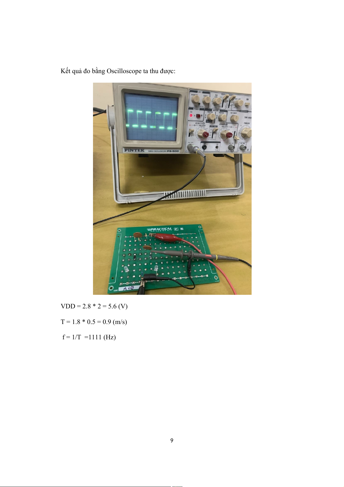 Kết quả đo bằng Oscilloscope ta thu được: VDD = 2.8 * 2 = 5.6 (V) T = 1.8 * 0.5 = 0.9 (m/s) f = 1/T =1111 (Hz) 9 5. Kết luận